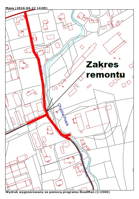 Informujemy, że w poniedziałek 25 kwietnia br. rozpoczną się prace remontowe nawierzchni drogi na ul. Chyców Potok.