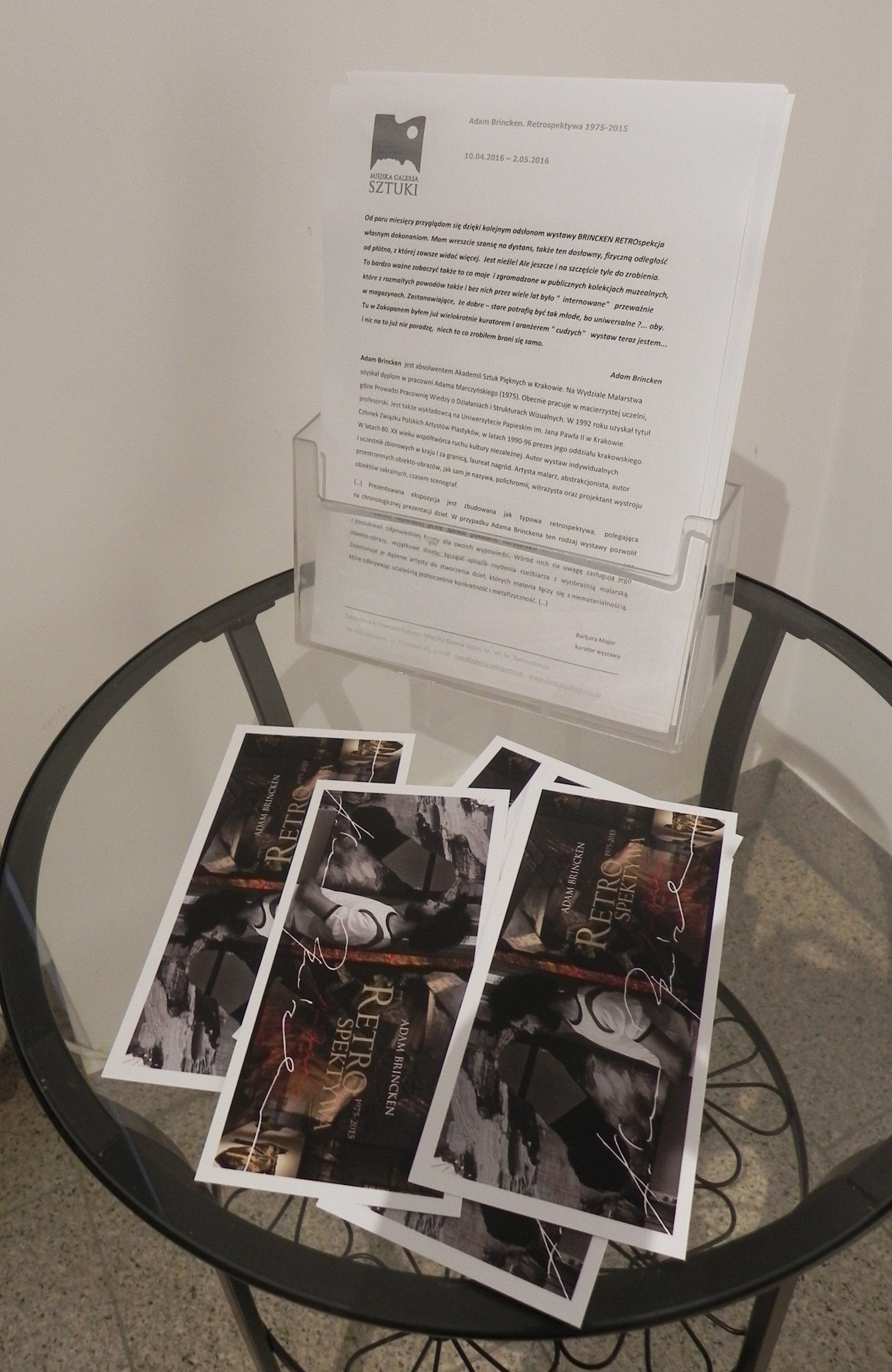 Adam Brincken - artysta malarz, abstrakcjonista, autor przestrzennych obiekto-obrazów, jak sam je nazywa, polichromii, witrażysta oraz projektant wystroju obiektów sakralnych, czasem scenograf. Tak różnorodna i złożona twórczość, opracowana merytorycznie przez kurator wystawy Barbarę Major oraz aranżacyjnie przez Annę Król, starszego kustosza z Muzeum Sztuki i Techniki Manggha w Krakowie, jest przedmiotem rozbudowanej wystawy retrospektywnej w Miejskiej Galerii Sztuki w Zakopanem. Dla zwiedzających oznacza to z całą pewnością przeżycia estetyczne jaki i doznania intelektualne.