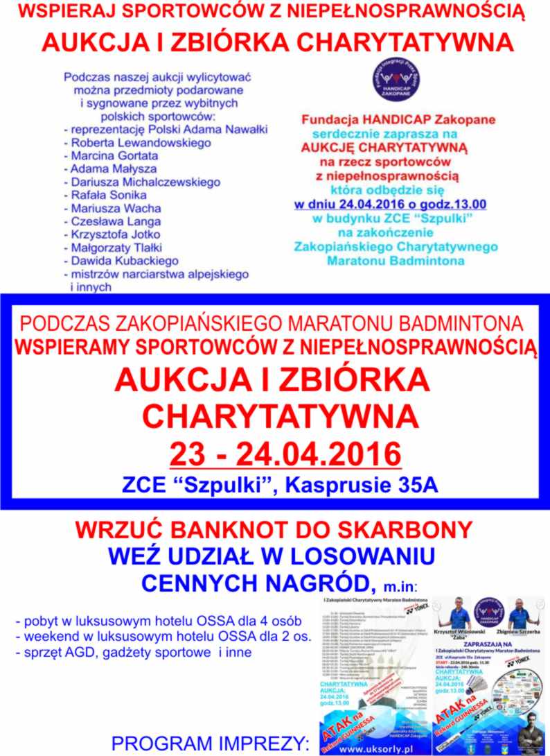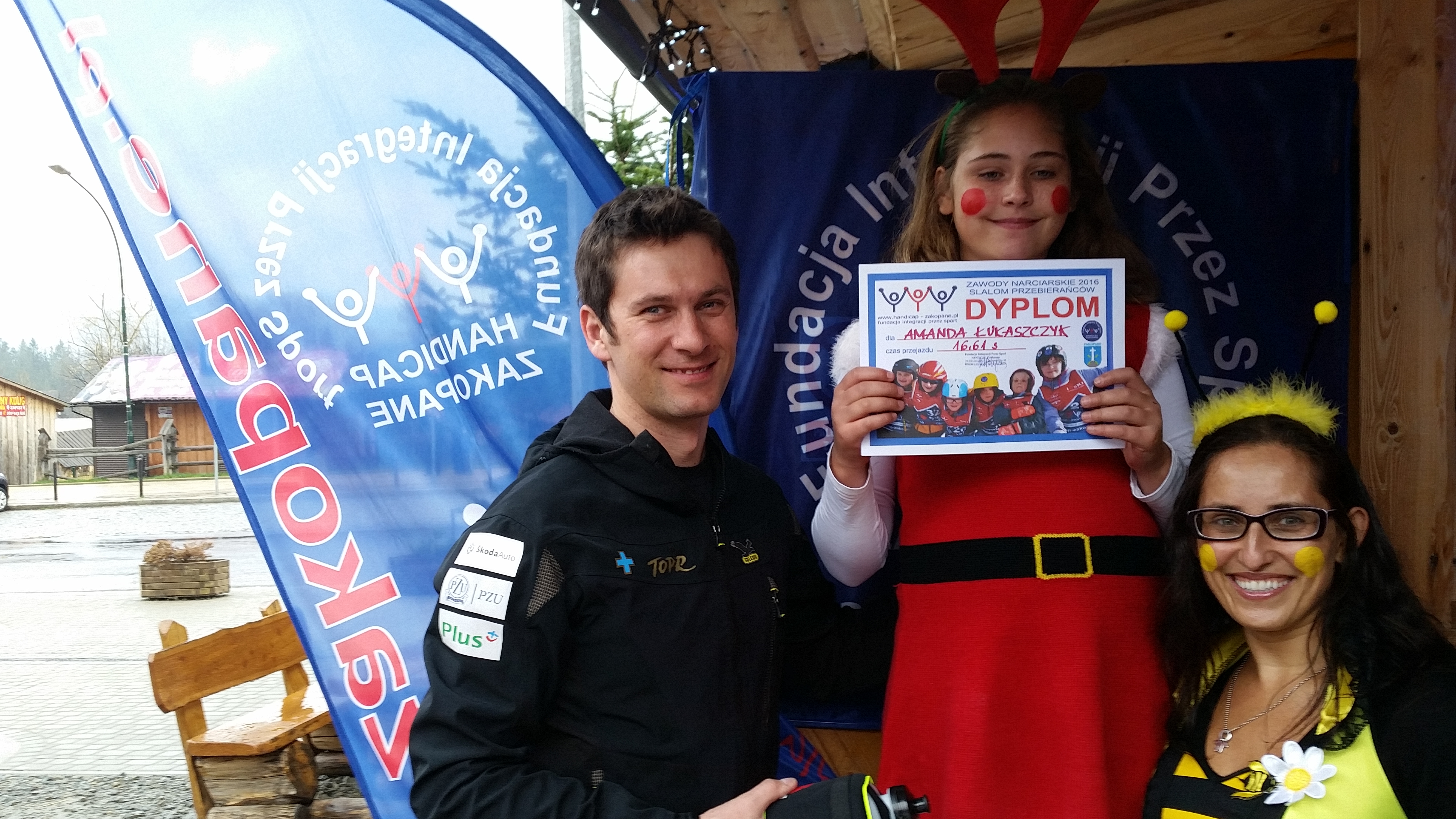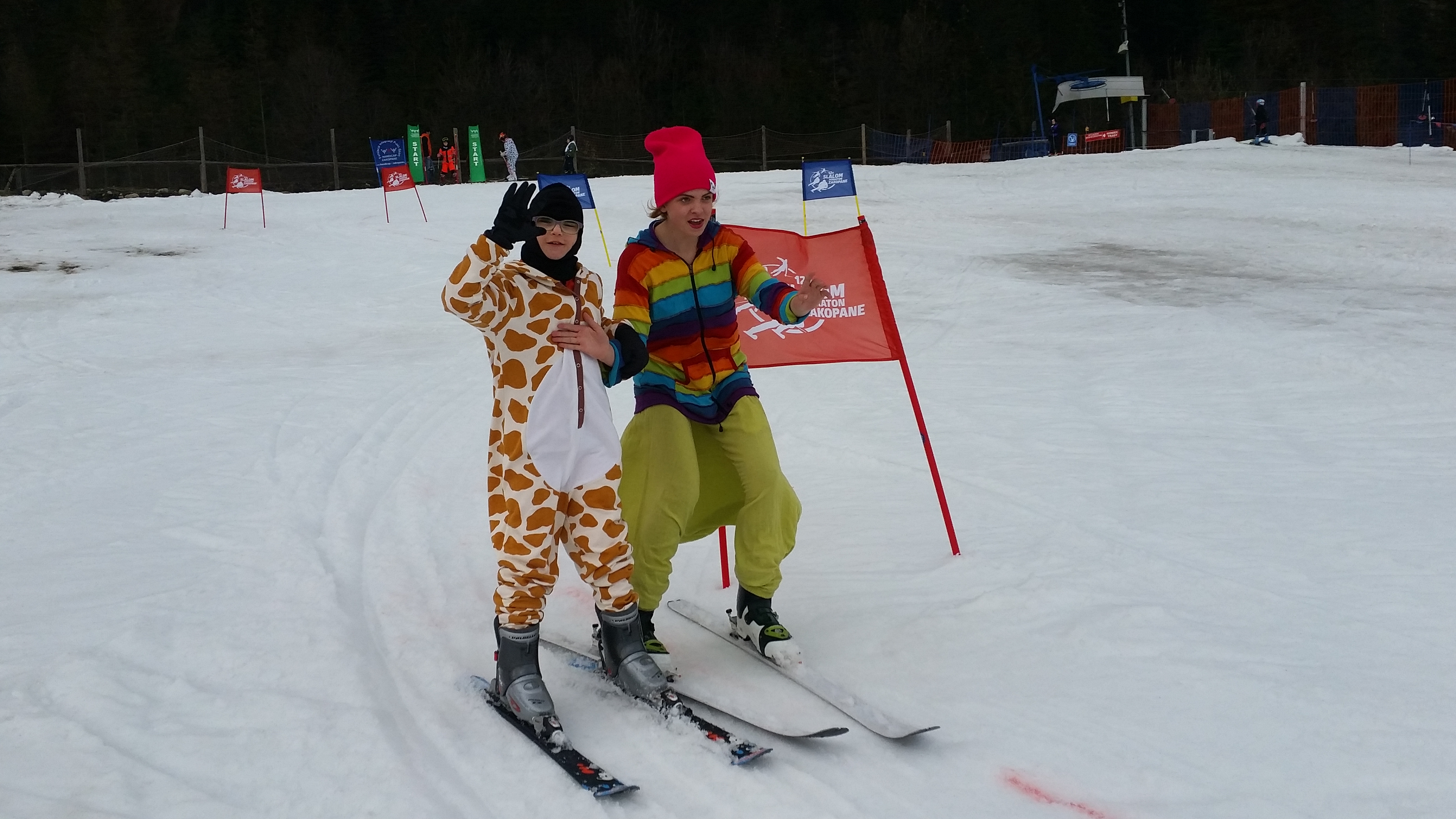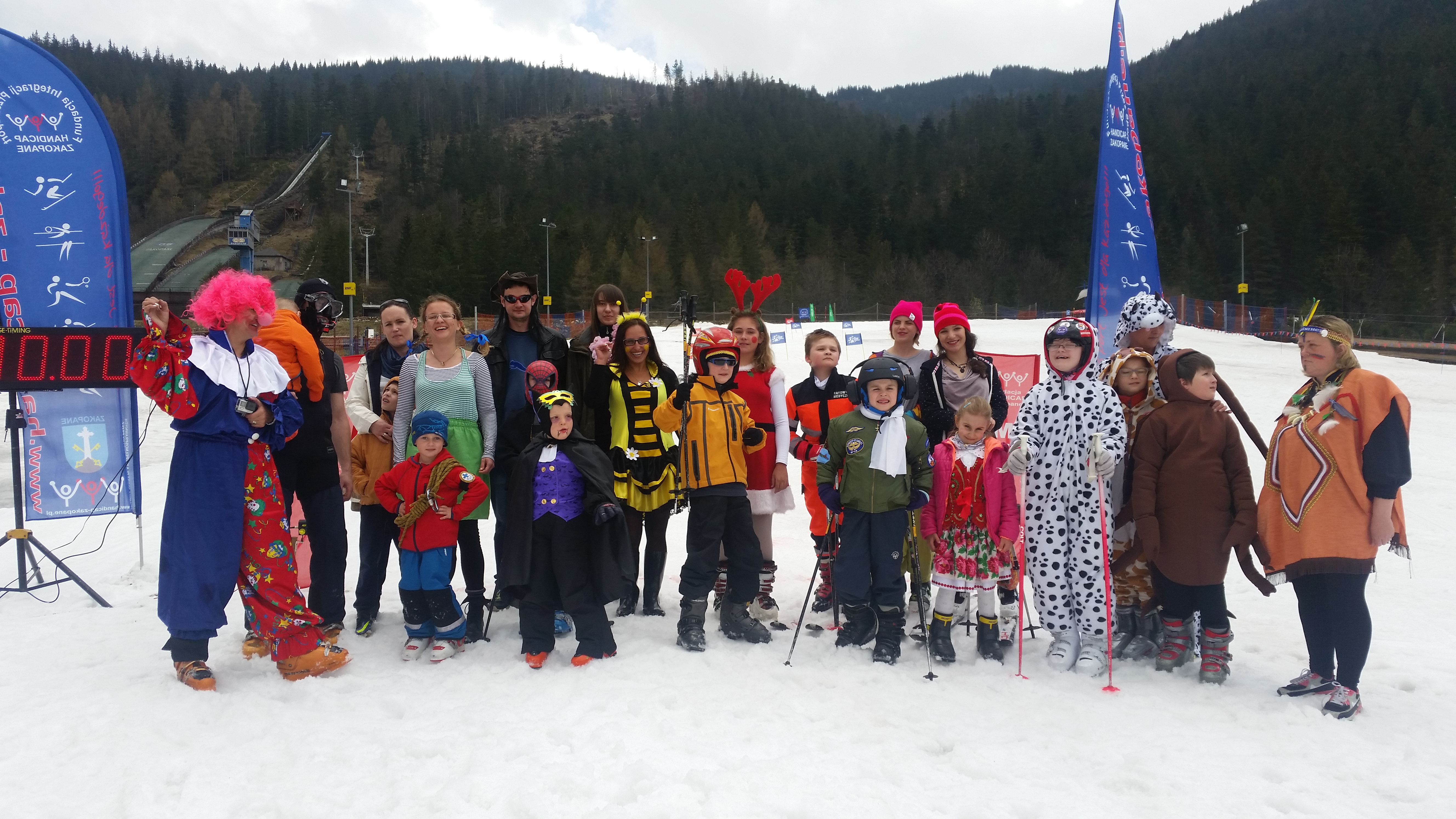 Na zakończenie zimy Fundacja HANDICAP Zakopane zorganizowała otwarte zawody narciarskie - Slalom Przebierańców. We wtorek, 5.04.2016, w ostatnim dniu funkcjonowania wyciągu tej zimy, na zawody na stoku GIGANT pod skocznią przybyli: tygrysek, krówka, nietoperz, góraleczka, byczek, reniferka, karaluszek,pilot, spiderman, ratownik TOPR, Bob Marley z dredami, pszczółka, wróżka, pippi, ratownik medyczny, indianka, dwie turczynki, kowboj, hawajka, klaun, a nawet nurek. Pomysłowość Zawodników, Rodziców i Opiekunów dała piękne efekty: było śmiesznie, kolorowo i radośnie. Zawodnicy jeździli po slalomie na czas coraz szybciej i poprawiali własne rekordy. Dla zmęczonych biciem swoich rekordów przygotowano mały poczęstunek, a po nim odbyło się ogłoszenie wyników i rozdanie nagród.