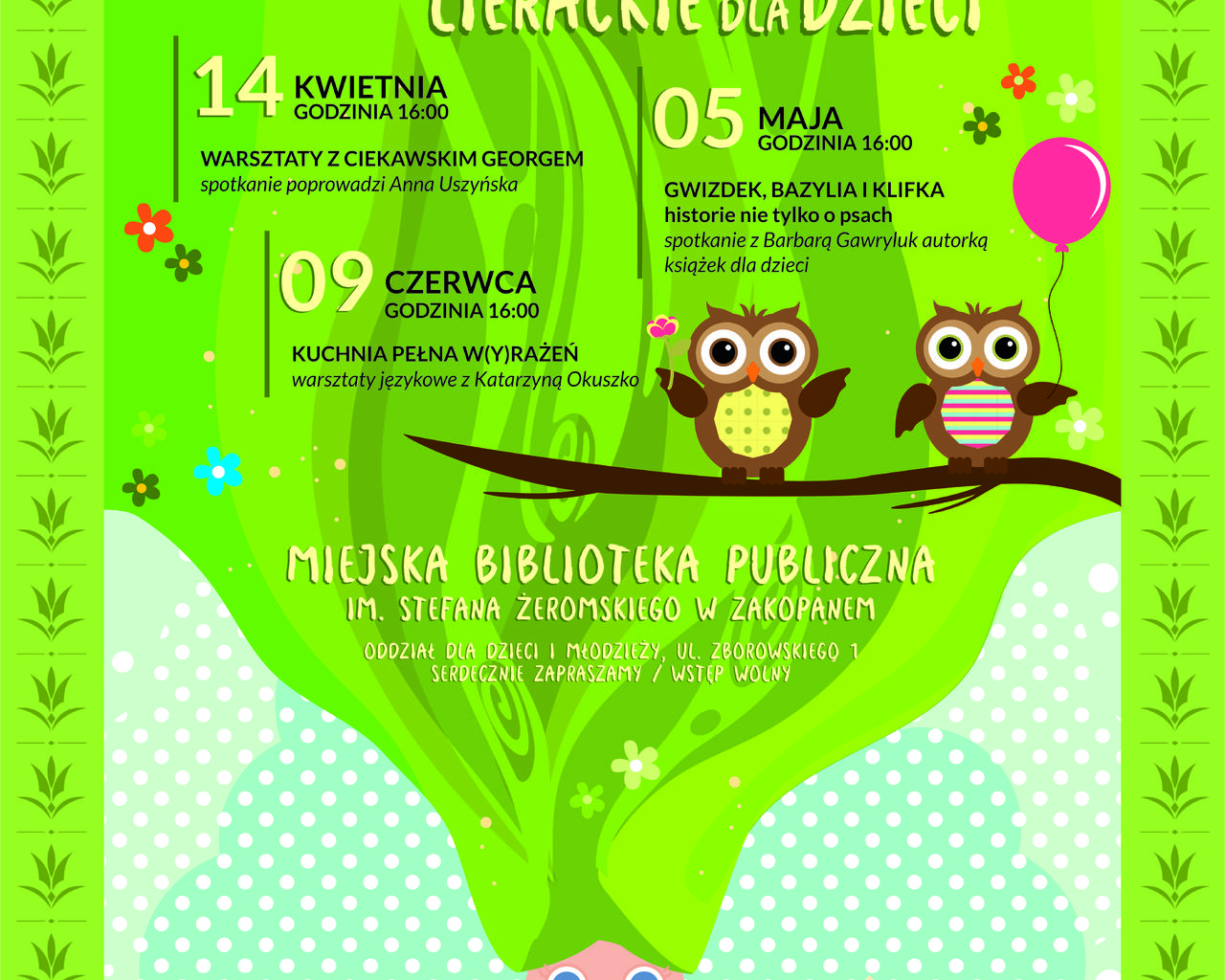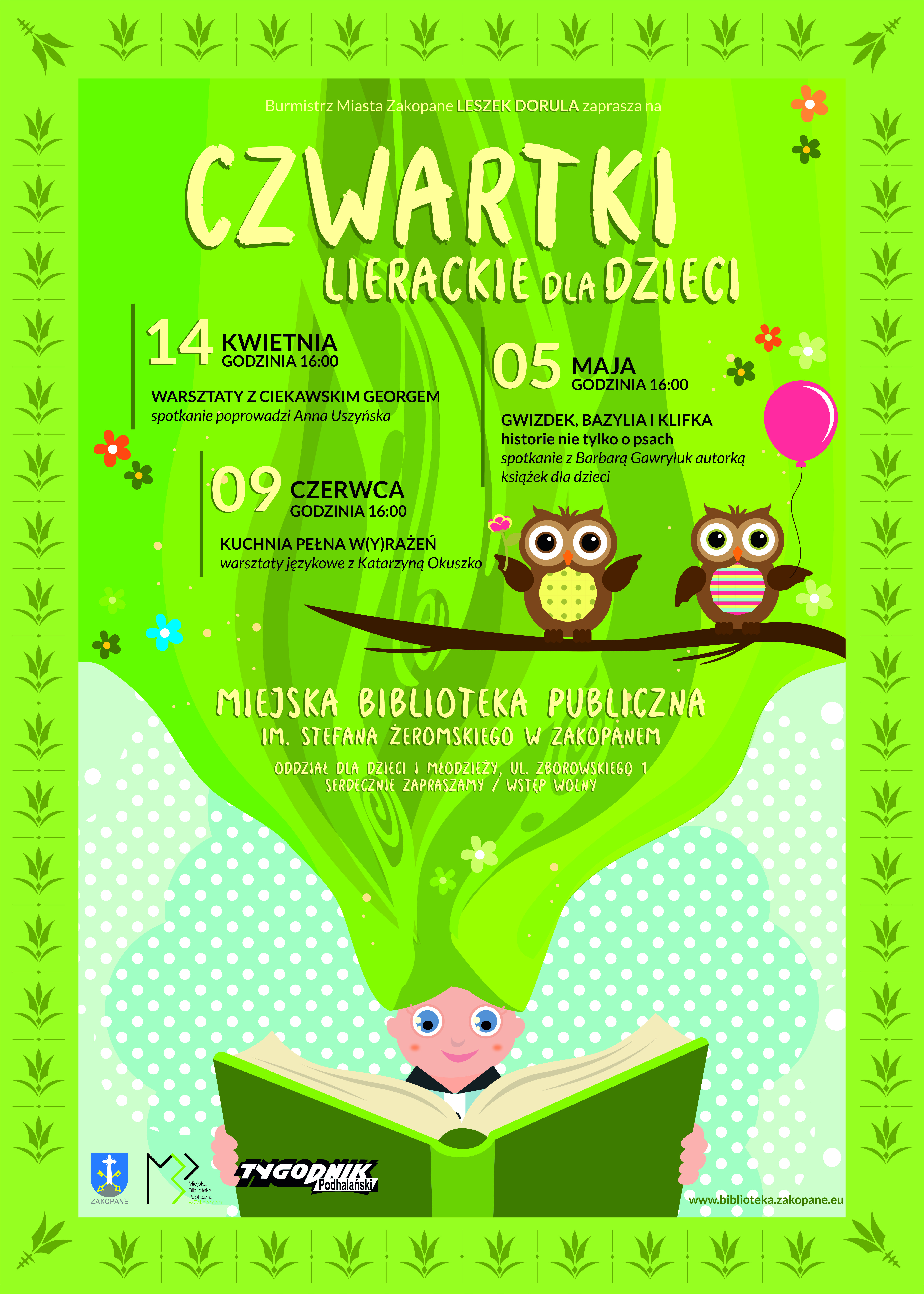 W czwartek, 14 kwietnia br., o godz. 16.00 w Miejskiej Bibliotece Publicznej im. Stefana Żeromskiego w Zakopanem, Oddziale dla Dzieci i Młodzieży przy ul. Zborowskiego 1, odbędą się Warsztaty z Ciekawski Georgem w ramach Czwartków Literackich dla Dzieci, które poprowadzi Anna Uszyńska.