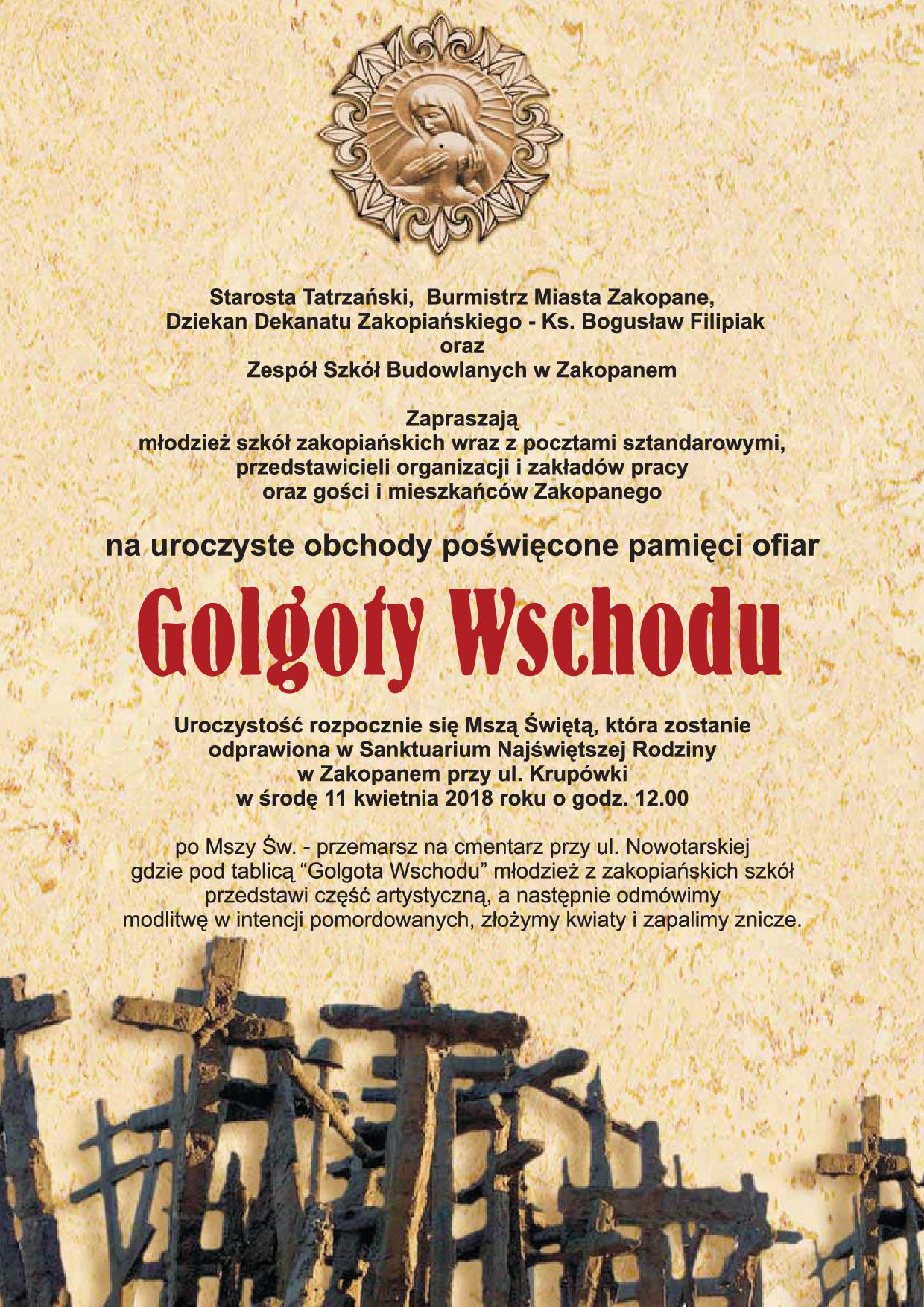 Starosta Tatrzański, Burmistrz Miasta Zakopane, Dziekan Dekanatu Zakopiańskiego i Zespół Szkół Budowlanych w Zakopanem serdecznie zapraszają na uroczyste obchody poświęcone pamięci ofiar „Golgoty Wschodu” w dniu 11 kwietnia 2018 r.