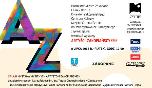 Burmistrz Miasta Zakopane Leszek Dorula, Dyrektor Zakopiańskiego Centrum Kultury, Miejska Galeria Sztuki im. Władysława hr. Zamoyskiego zapraszają na wernisaż wystawy „Artyści Zakopiańscy 2016”, który odbędzie się 8 lipca o godzinie 17.00.