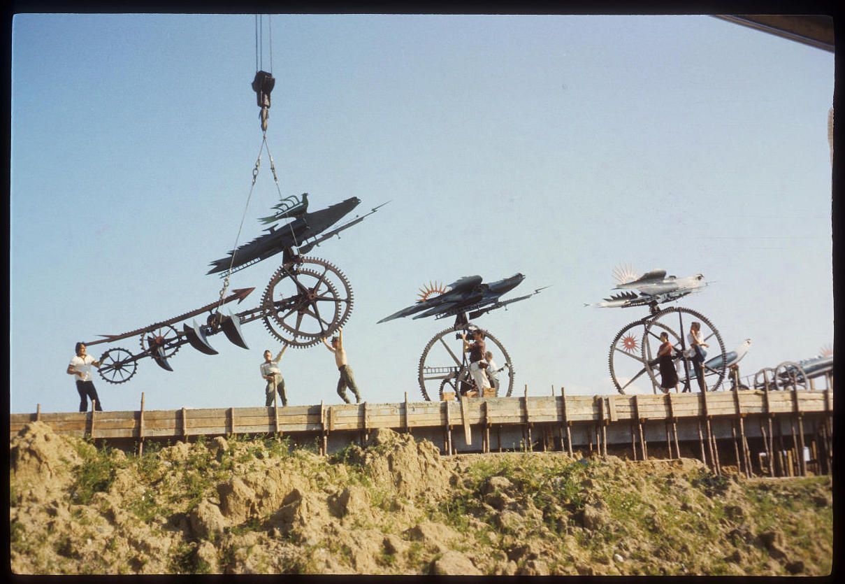 Zdjęcie ze zbiorów Muzeum Tatrzańskiego w Zakopanem, przedstawiające budowę i montaż pomnika "Tym, którzy walczyli o polskość i wolność ziem Pomorza" w Koszalinie (cykl slajdów W. Hasiora Ptaki Koszalin).
