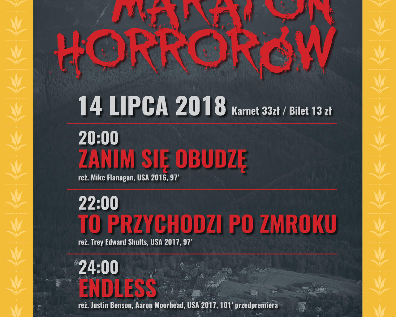 Kino miejsce zaprasza na wakacyjny Maraton Horrorów. 14 lipca od godziny 20.00. W programie: "Zanim się obudzę" (reż. Mike Flanagan), "To przychodzi po zmroku" (reż. Trey Edward Shults), "Endless" (reż. Justin Benson)