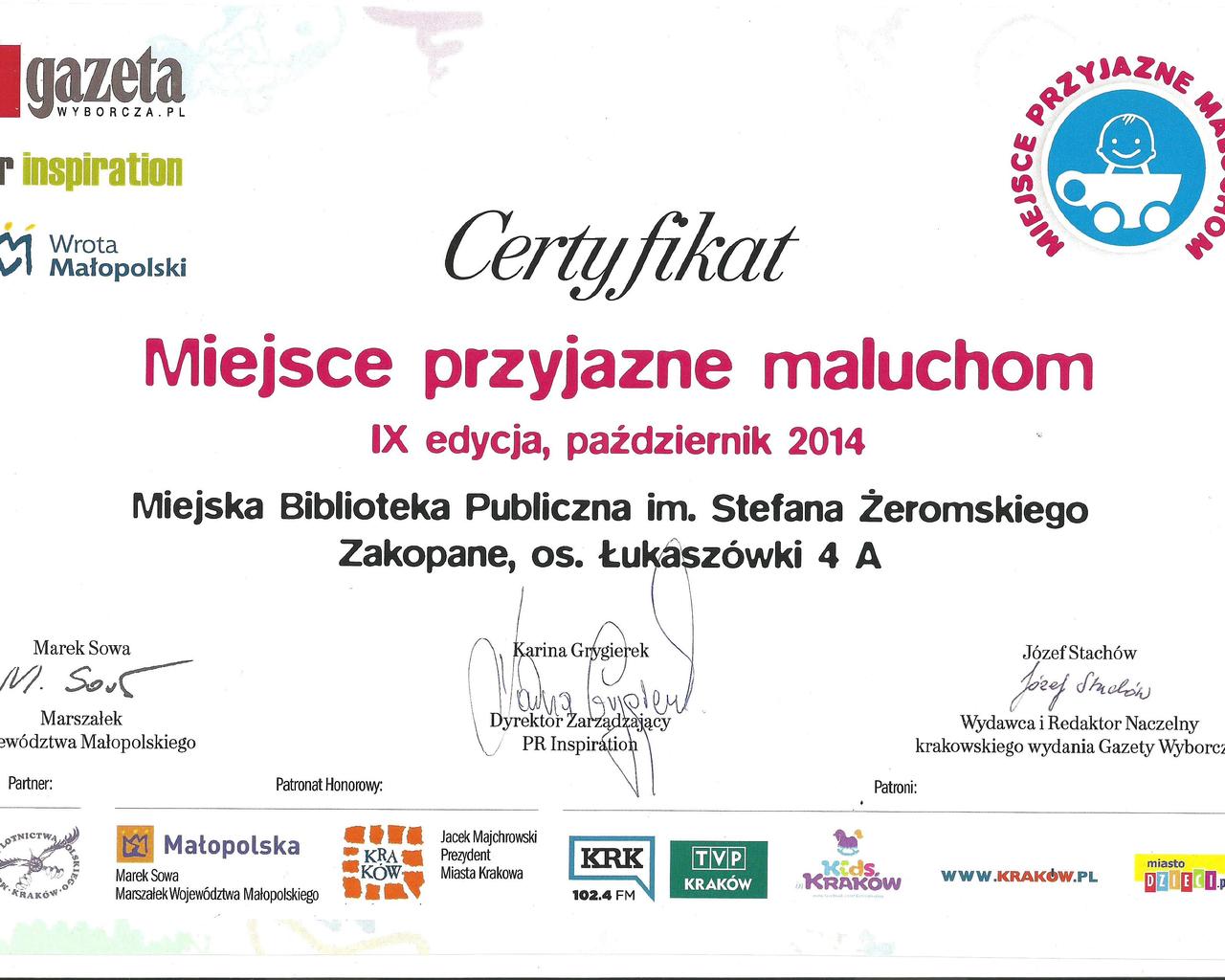 Miejska Biblioteka Publiczna im. Stefana Żeromskiego została nagrodzona certyfikatem „Miejsce Przyjazne Maluchom”. Znalazła się ona wśród 10 laureatów z terenu Zakopanego. Certyfikat w niedzielę, 19 października 2014 r., podczas uroczystej gali w Muzeum Lotnictwa Polskiego w Krakowie odebrała dyrektor biblioteki Bożena Gąsienica.