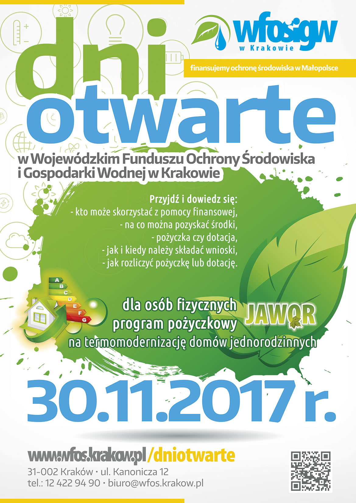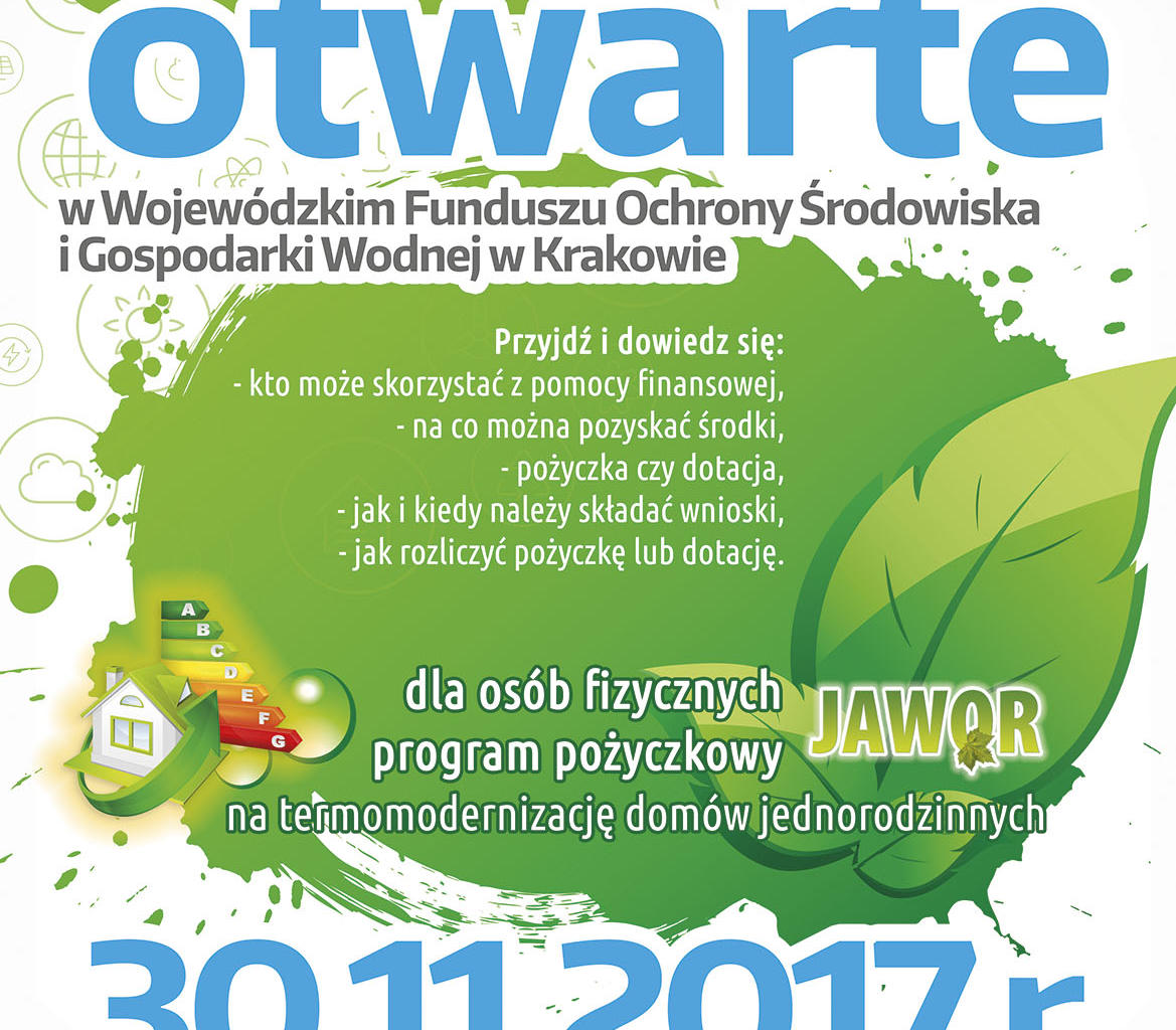 Zapraszamy wszystkich zainteresowanych na kolejny Dzień Otwarty Wojewódzkiego Funduszu Ochrony Środowiska i Gospodarki Wodnej w Krakowie, który tradycyjnie odbędzie się w ostatni czwartek miesiąca, czyli 30 listopada 2017 r. w godzinach 8.00-15.00 w siedzibie Funduszu (parter, ul. Kanonicza 12).