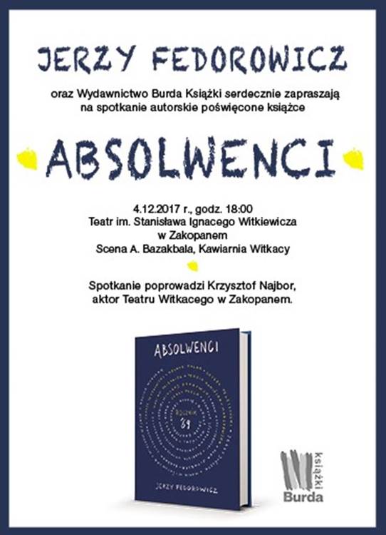 Senator RP Jerzy Fedorowicz oraz Dyrektor Teatru im. Stanisława Ignacego Witkiewicza w Zakopanem Andrzej Dziuk zapraszają na promocję książki Jerzego Fedorowicza – „Absolwenci. Rocznik ‘69”.