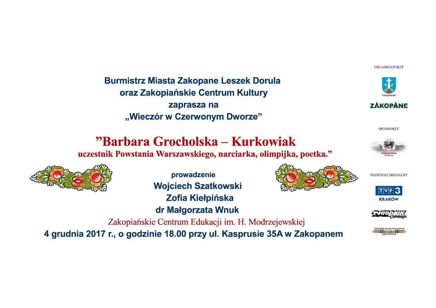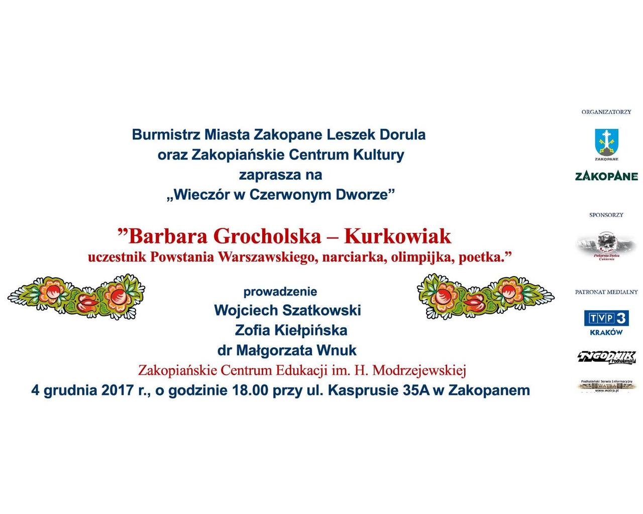 Burmistrz Miasta Zakopane Leszek Dorula i Zakopiańskie Centrum Kultury zapraszają na kolejny "Wieczór w Czerwonym Dworze" tym razem poświęcony wybitnej narciarce, poetce, uczestniczce Powstania Warszawskiego Barbarze Grocholskiej-Kurkowiak.