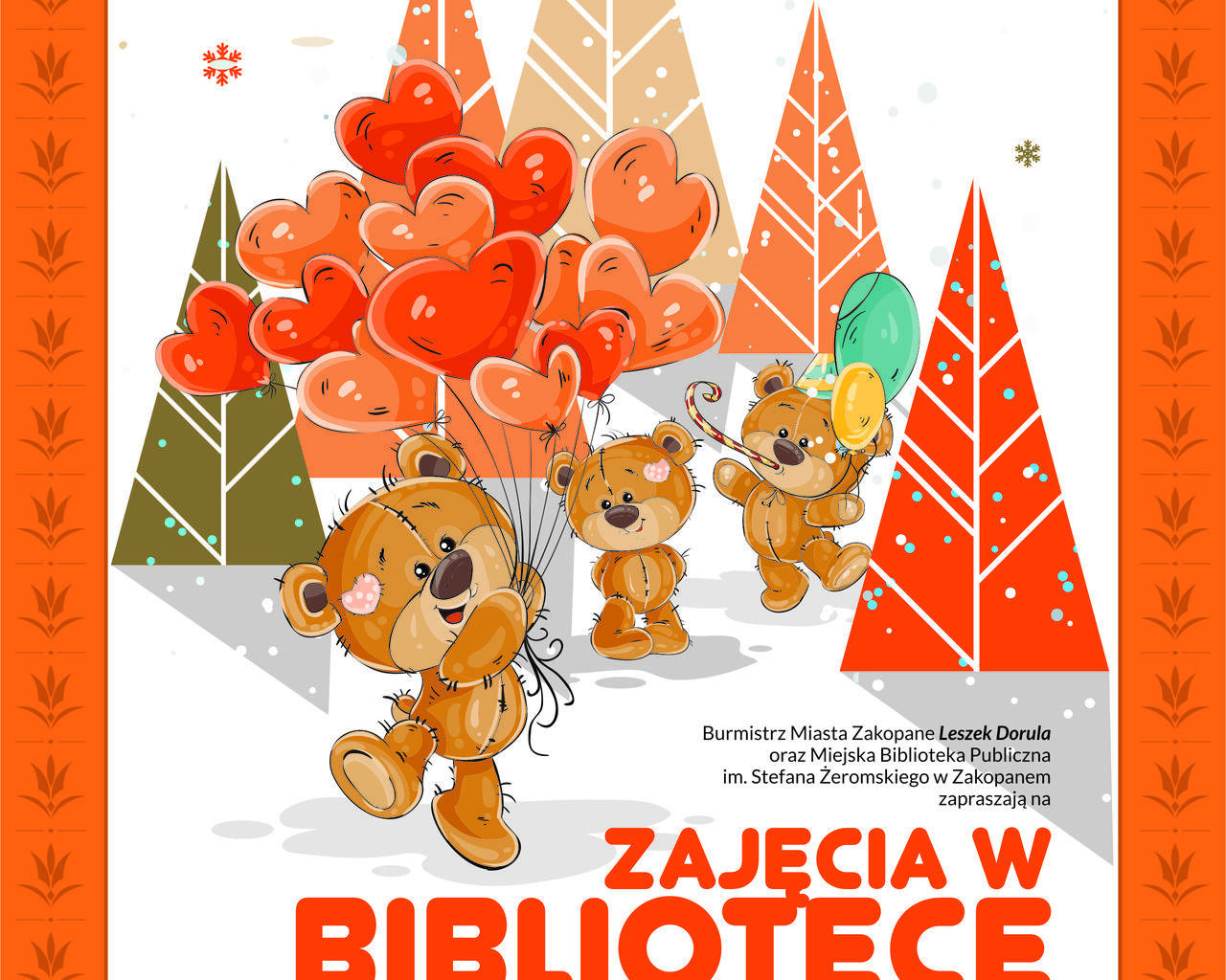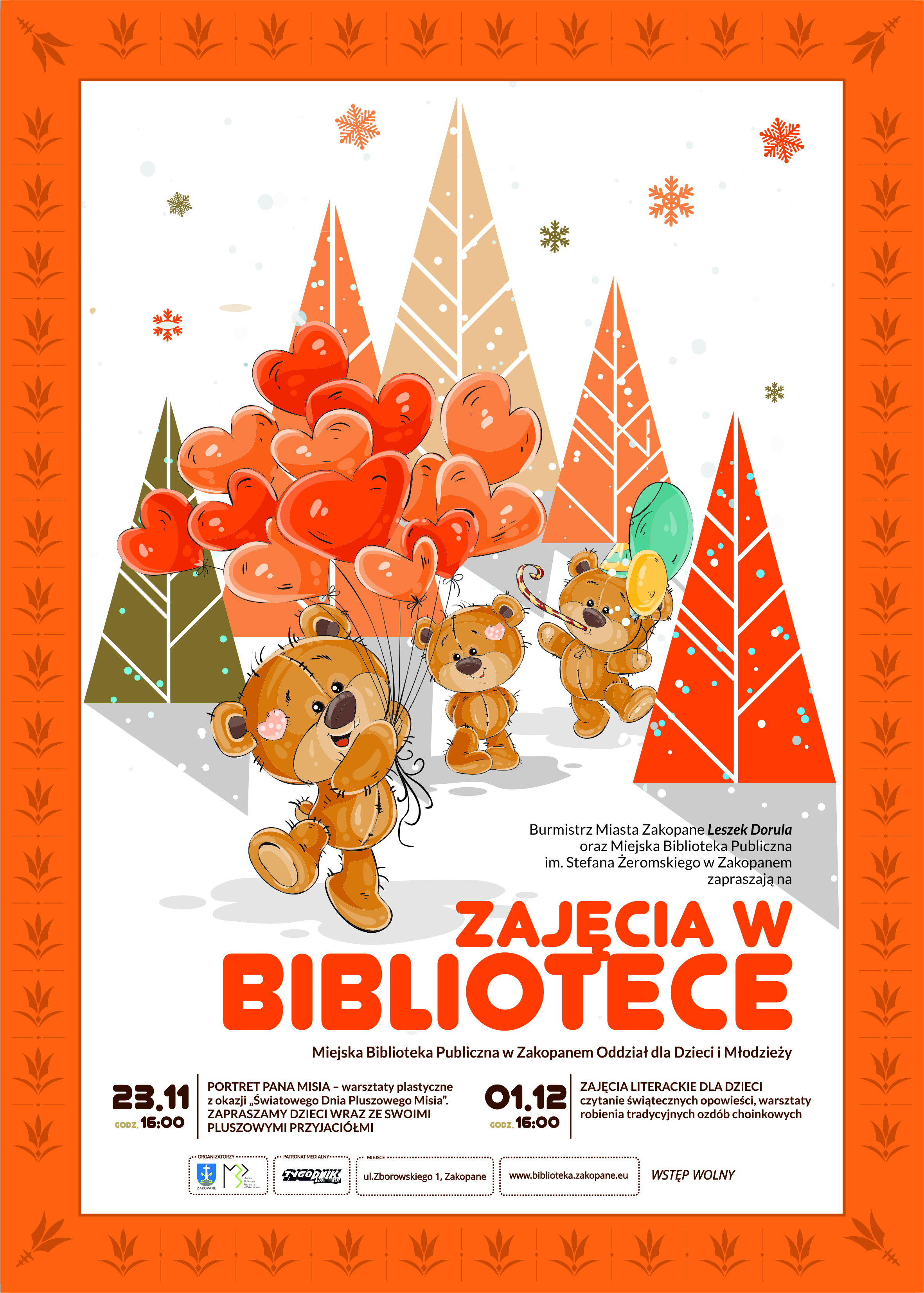 Burmistrz Miasta Zakopane Leszek Dorula oraz Miejska Biblioteka Publiczna im. Stefana Żeromskiego zapraszają na ZAJĘCIA W BIBLIOTECE: 23/11/2017 r., godz. 16:00 PORTRET PANA MISIA – warsztaty plastyczne z okazji „Światowego Dnia Pluszowego Misia”. Zapraszamy dzieci wraz ze swoimi pluszowymi przyjaciółmi.