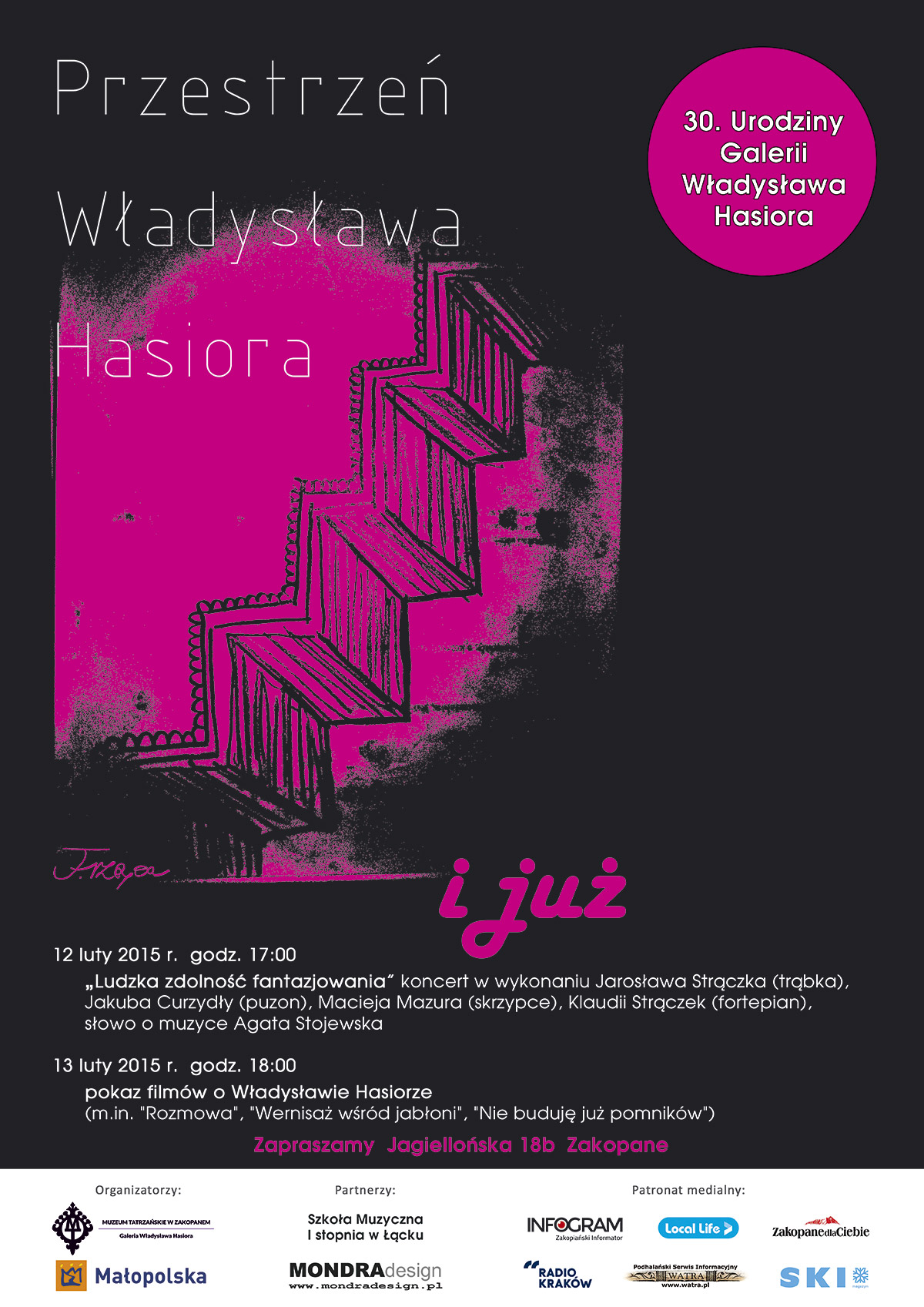 Muzeum Tatrzańskie zaprasza na dwudniowe, 12 i 13 lutego, świętowanie trzydziestych urodzin Galerii Władysława Hasiora. W programie przewidujemy koncert pt. „Ludzka zdolność fantazjowania” współorganizowany przez Agatę Stojewską ze Szkoły Muzycznej I Stopnia w Łącku oraz pokaz filmów o artyście, na którym będzie można zobaczyć m.in. pierwszy materiał filmowy na temat Władysława Hasiora pt. „Rozmowa” w reż. M. Kwiatkowskiej z 1962 roku, a także filmy z kolekcji Urszuli Dubowskiej.