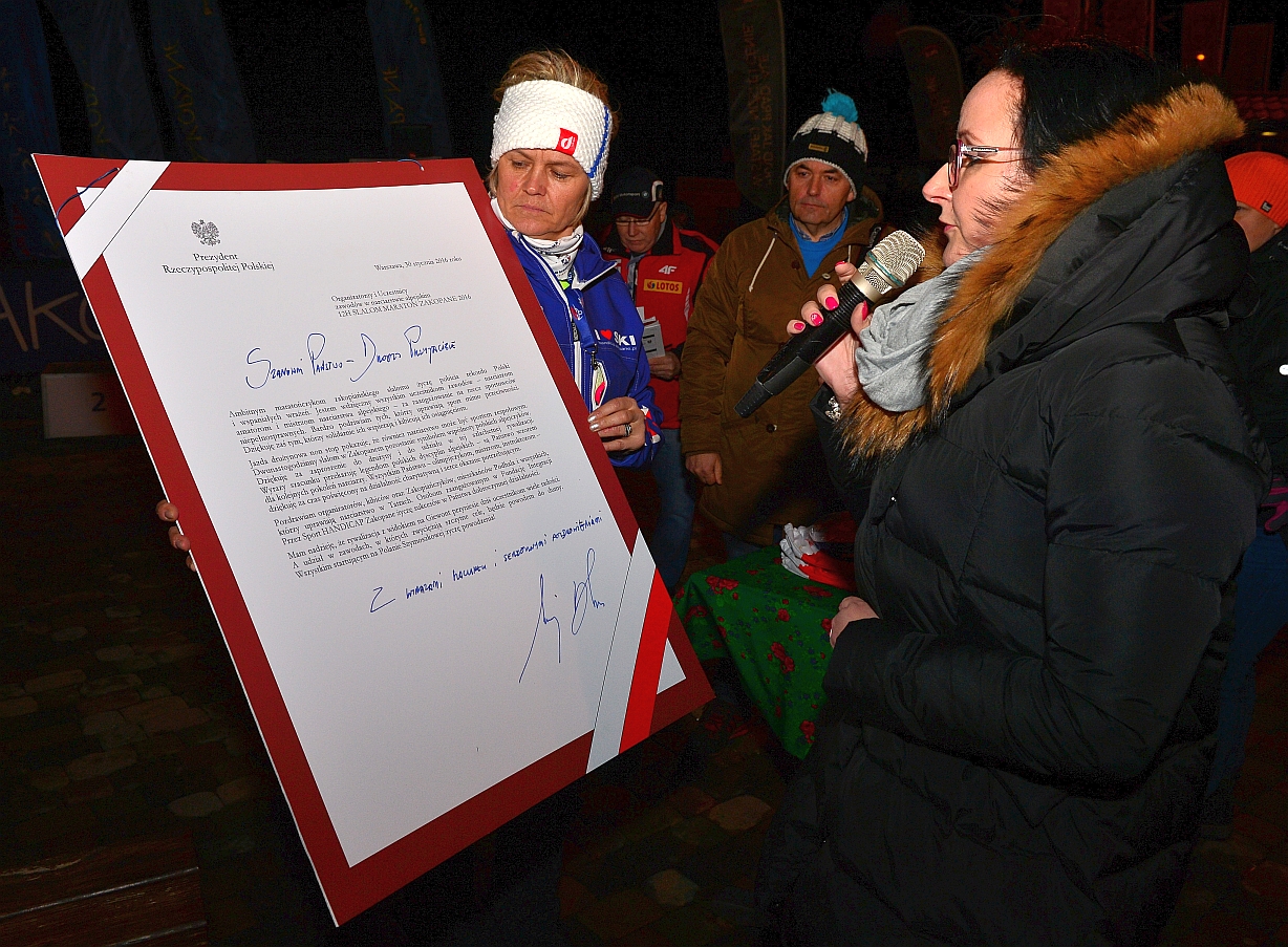Niedzielny slalom zaczął się z ponad godzinnym opóźnieniem, dlatego narciarze jeździli aż do godziny 21.15. Całodniowy maraton prowadziła aktorka Aleksandra Mikołajczyk i Czesław Fluder znany propagator sportów zimowych. Pogoda i warunki śniegowe nie oszczędziły sportowców, na szczęście gorący doping podopiecznych Fundacja Handicap Zakopane dodał zawodnikom sił do wytrwania w tej trudnej próbie i przejechania łącznie 602 km, co pozwoliło pobić zeszłoroczny wynik 558 km i ustanowić nowy rekord Polski. Z tej okazji Delegat Techniczny FIS Krzysztof Horecki przekazał na ręce kapitana drużyny Małgorzaty Tlałki-Długosz przechodni puchar będący świadectwem ustanowienia rekordu. Puchar ten został przekazany przez drużynę na ręce Wiceburmistrz Agnieszki Nowak-Gąsienicy i zajmie honorowe miejsce w Urzędzie Miasta Zakopane, aby zachęcać kolejnych śmiałków do pobicia tegorocznego rekordu. Pamiątkowe statuetki i gratulacje w imieniu Burmistrza Miasta Zakopane Leszka Doruli przekazała zawodnikom oraz gościom honorowym Wiceburmistrz Agnieszka Nowak-Gąsienica. Okolicznościowe statuetki i podziękowania zostały również wręczone sponsorom i partnerom wydarzenia. Podczas uroczystego zakończenia odczytano oficjalny list od Prezydenta Andrzeja Dudy, który gratulował uczestnikom i organizatorom podjęcia próby ataku na Rekord Polski i dziękował za integrację narciarzy i wrażliwość okazaną sportowcom niepełnosprawnym.