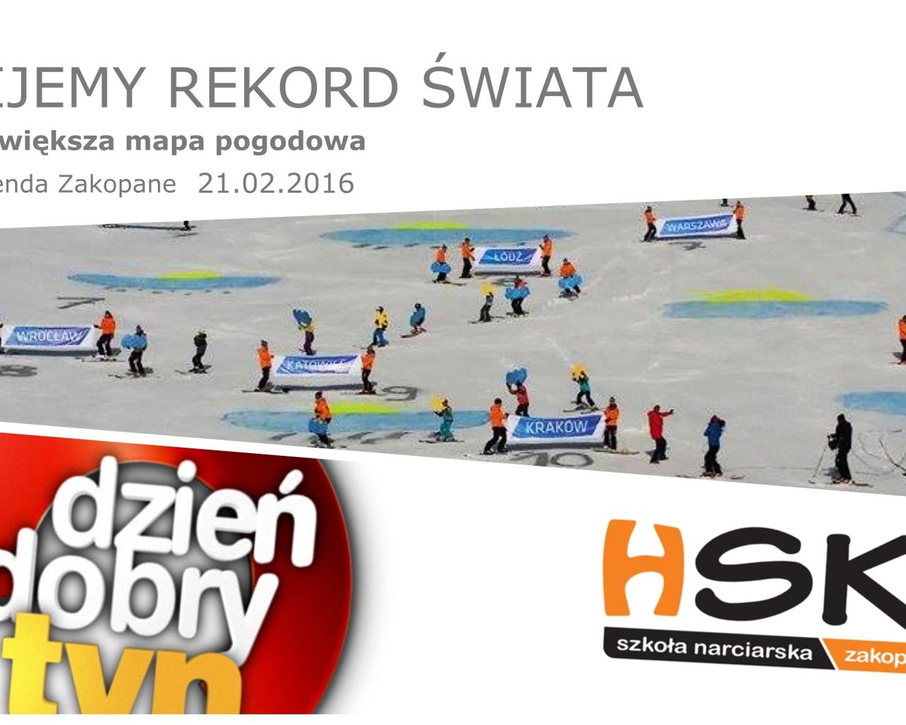 Zapraszamy rodziny z całej Polski do uczestnictwa w biciu rekordu świata - największej mapie pogodowej, w niedzielę 21 lutego o godz. 9.00 na Harendzie. Każdy z Was będzie tworzył to wielkie wydarzenie. Przyjdźcie i napiszcie na mapie skąd jesteście.