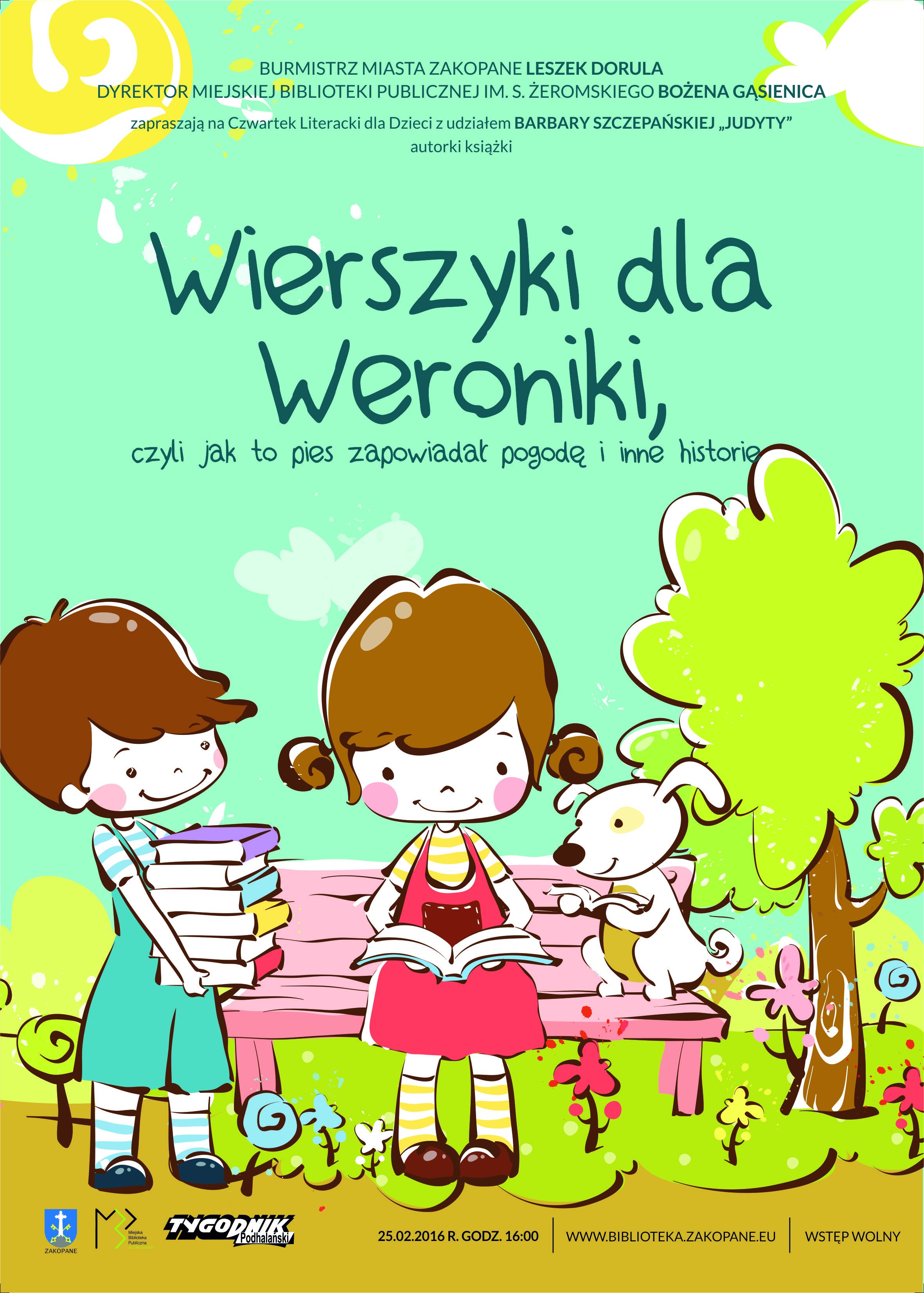 Burmistrz Miasta Zakopane Leszek Dorula oraz Dyrektor Miejskiej Biblioteki Publicznej im. Stefana Żeromskiego Bożena Gąsienica zapraszają na Czwartek Literacki dla Dzieci z udziałem Barbary Szczepańskiej „Judyty” autorki książki „Wierszyki dla Weroniki, czyli jak to pies zapowiadał pogodę”. 25 lutego br., godz. 16.00, Oddział dla Dzieci i Młodzieży, ul. Zborowskiego 1. Wstęp wolny.