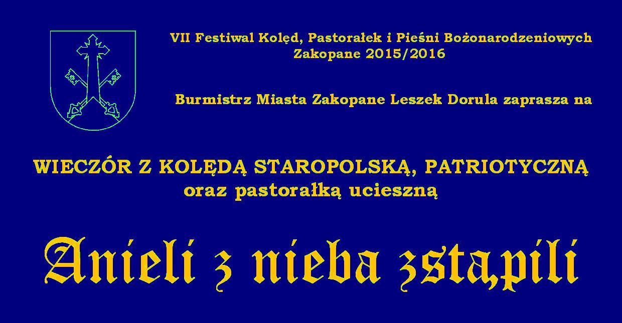 Burmistrz Miasta Zakopane Leszek Dorula i Tatrzańska Orkiestra Klimatyczna serdecznie zapraszają na WIECZÓR Z KOLĘDĄ STAROPOLSKĄ, PATRIOTYCZNĄ I PASTORAŁKĄ UCIESZNĄ "ANIELI Z NIEBA ZSTĄPILI" w ramach VII Festiwalu Kolęd, Pastorałek i Pieśni Bożonarodzeniowych, 31 stycznia 2016, godz. 18.00, kościół Miłosierdzia Bożego, ul. Chramcówki 19.