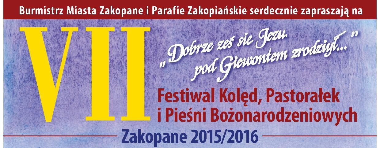 Burmistrz Miasta Zakopane Leszek Dorula i Parafie Zakopiańskie zapraszają na VII Festiwal Kolęd, Pastorałek i Pieśni Bożonarodzeniowych "Dobrze ześ sie Jezu pod Giewontem zrodziył..."