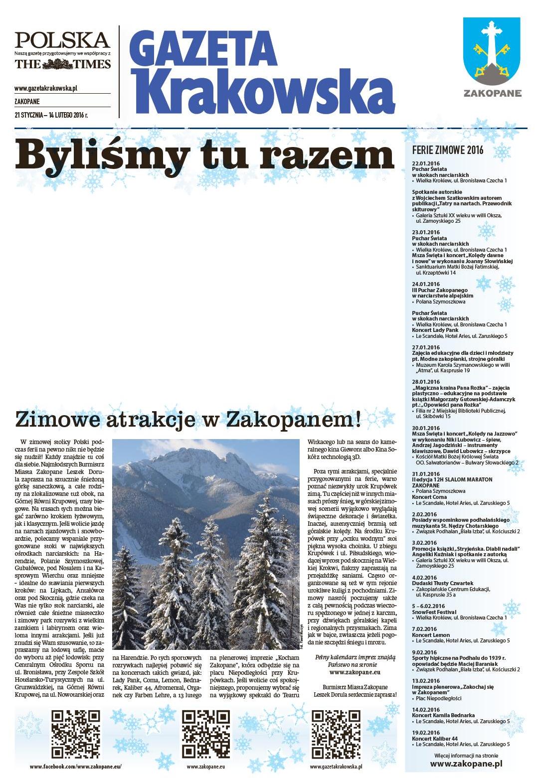 Burmistrz Miasta Zakopane Leszek Dorula serdecznie zaprasza do odwiedzania Zimowej Redakcji Gazety Krakowskiej, która w dniach od 21 stycznia do 14 lutego 2016 mieścić się będzie w Kawiarni Europejska, przy ul. Krupówki 37.