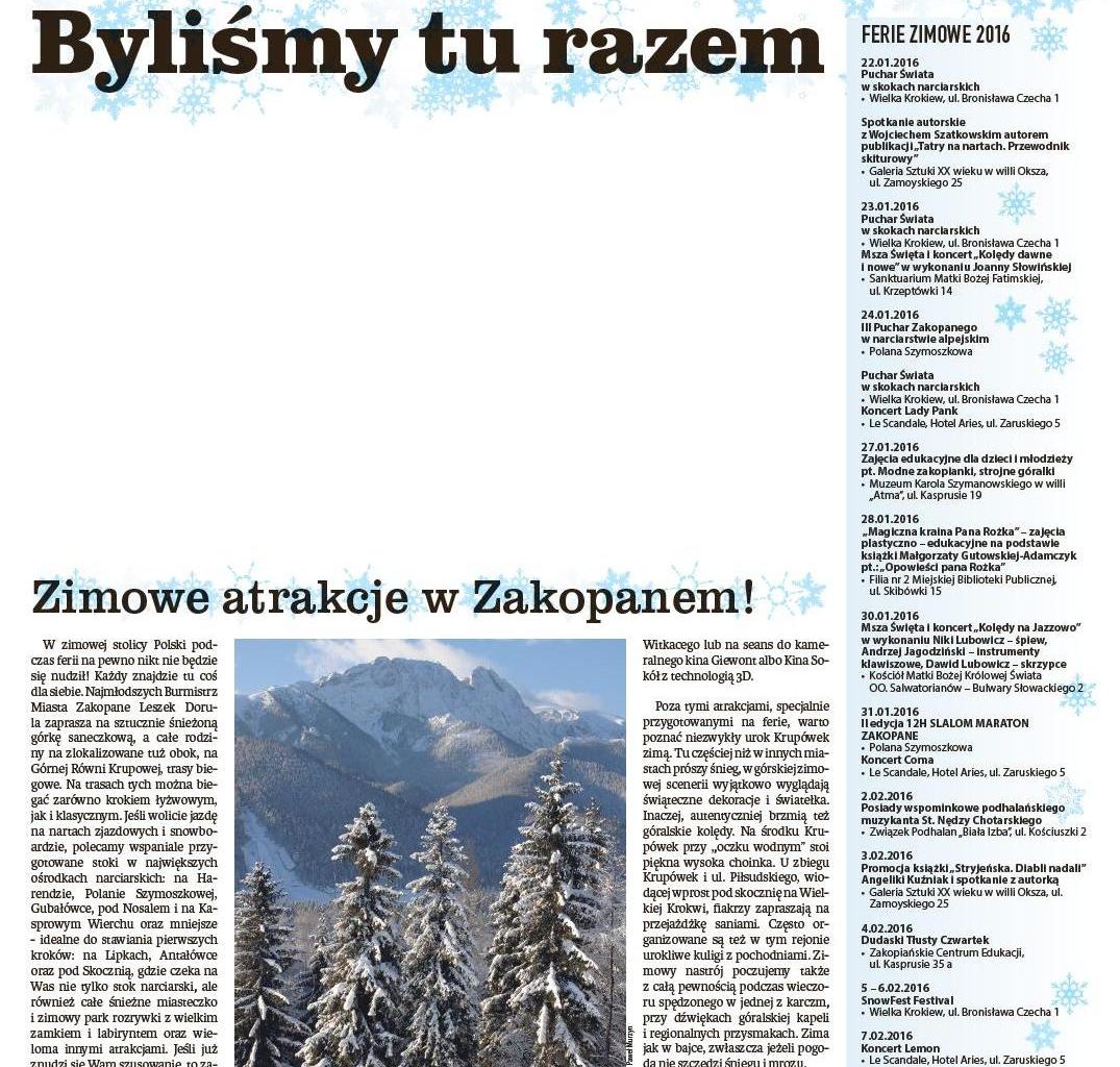 Podczas tegorocznych ferii zimowych specjalnie dla Państwa, po raz pierwszy zorganizowana została Zimowa Redakcja Gazety Krakowskiej, którą współtworzyć będą osobowości znane z pierwszych stron gazet, ekranów telewizyjnych, czy scen teatralnych. Zapraszani będą pasjonaci i promotorzy sztuki, rzeźby, malarstwa,oraz muzycy.