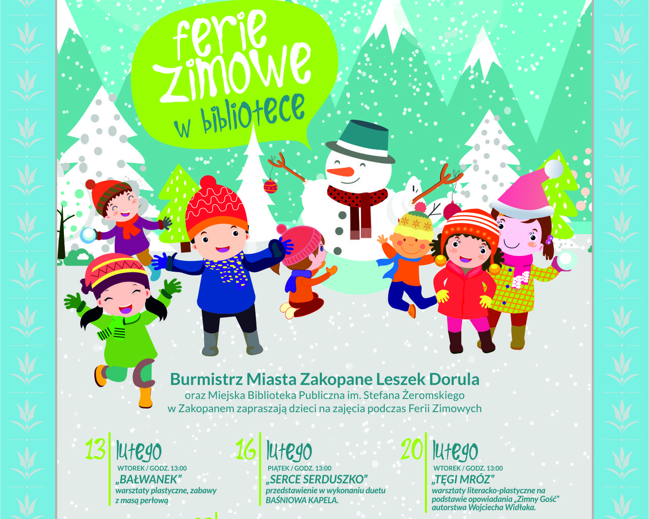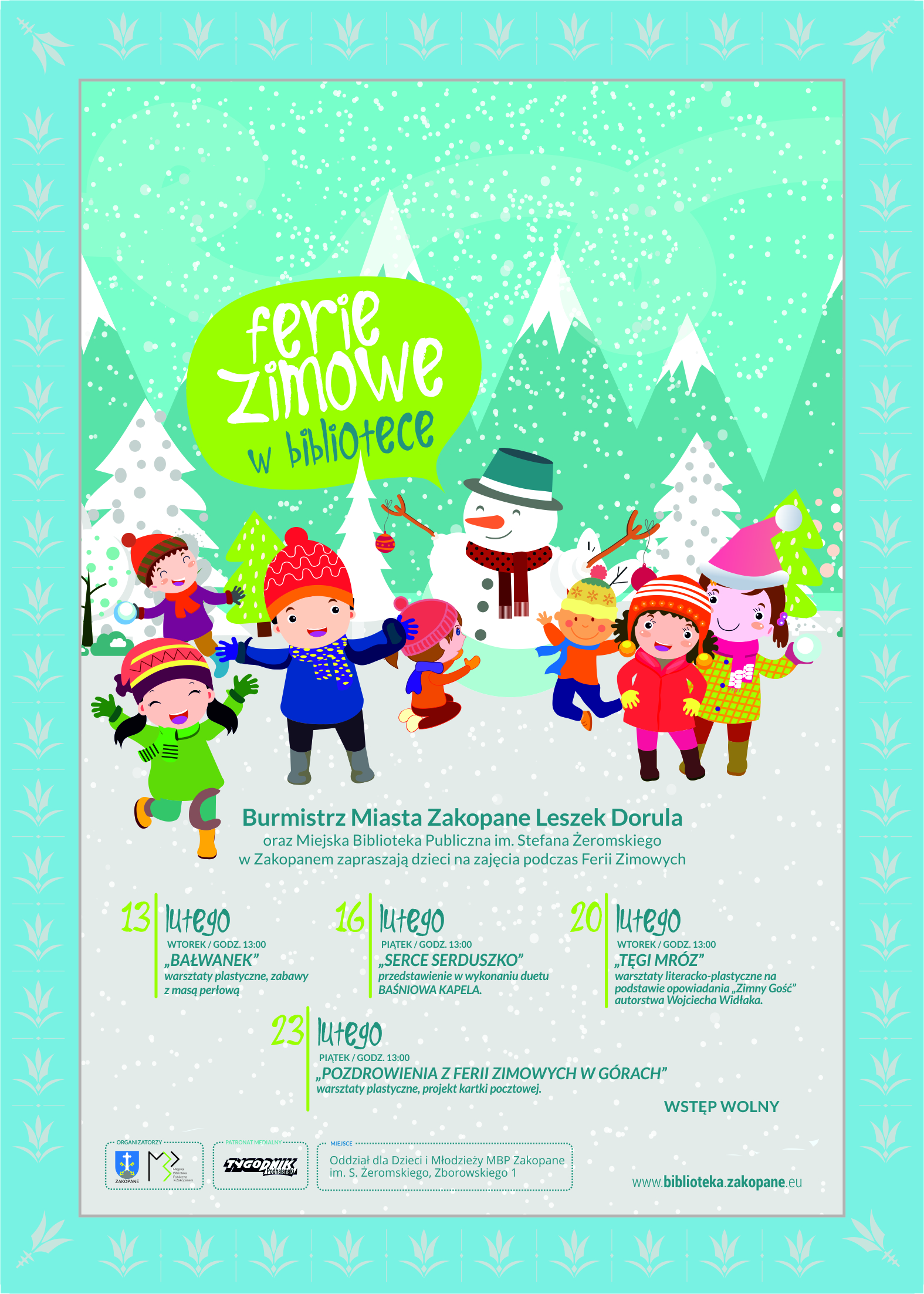 Burmistrz Miasta Zakopane Leszek Dorula, Miejska Biblioteka Publiczna im. Stefana Żeromskiego w Zakopanem zapraszają dzieci na zajęcia podczas ferii zimowych.