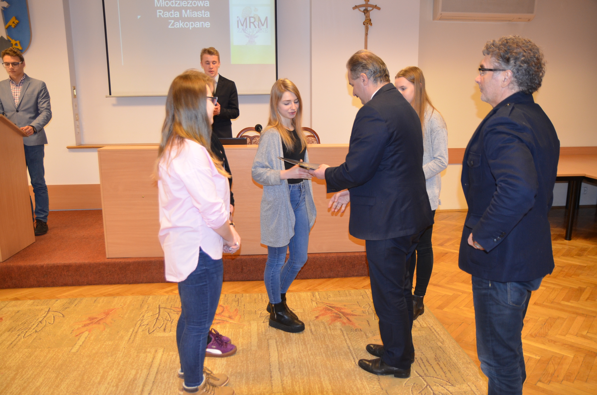 Na sesji nie zabrakło przedstawicieli zakopiańskich szkół, którym sekretarz Rady Julia Dziedzic przedstawiła prezentację multimedialną przedstawiającą model funkcjonowania Młodzieżowych Rad oraz działania planowane i te już podjęte przez młodzież. Część projektów została zapoczątkowana przez radnych minionej kadencji, którzy w dniu wczorajszym reprezentowani byli przez byłe prezydium Młodzieżowej Rady Miasta: Kamila Nowaka, Natalię Kmiecik i Justynę Lasiak.