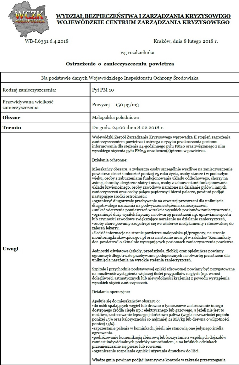 Wojewódzki Zespół Zarządzania Kryzysowego wprowadza II stopień zagrożenia zanieczyszczeniem powietrza i ostrzega o ryzyku przekroczenia poziomu informowania dla stężenia 24-godzinnego pyłu PM10 oraz związanego z nim wysokiego stężenia pyłu PM2,5 oraz benzo(a)pirenu w powietrzu.