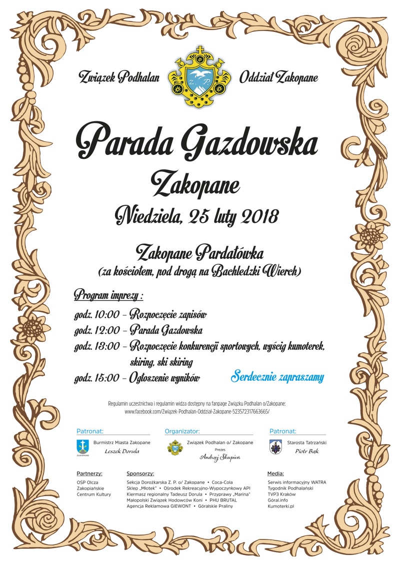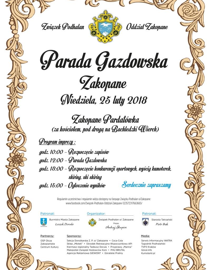 Związek Podhalan oddział Zakopane zaprasza na Paradę Gazdowską, która odbędzie się w niedzielę 25 lutego 2018r. w Zakopanem - na Pardałówce za kościołem pod drogą na Bachledzki Wierch.