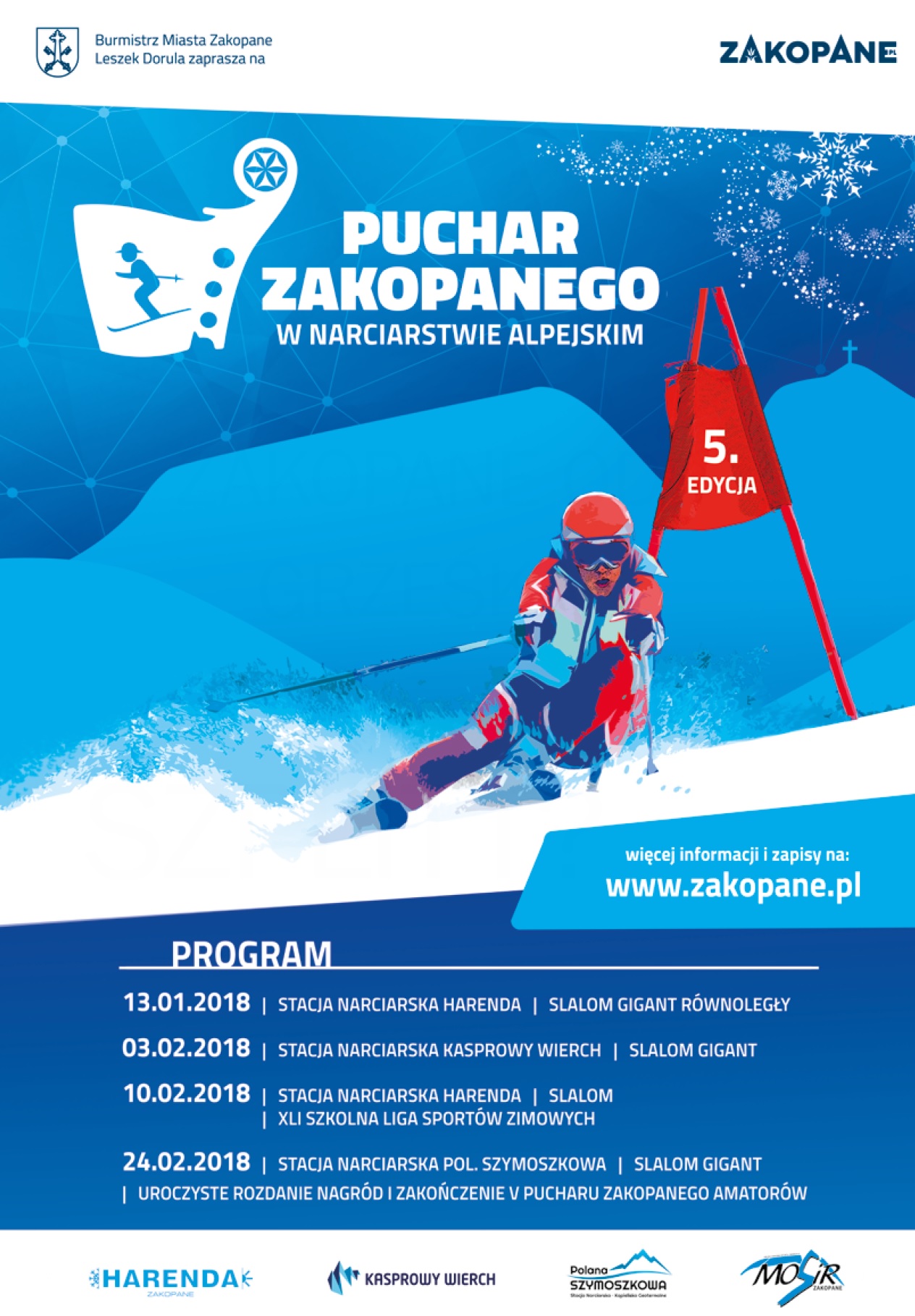 Piąta edycja zawodów rozpoczęła się 13 stycznia na zakopiańskiej Harendzie. Już w sobotę, 3 lutego, zawodnicy będą rywalizować na Kasprowym Wierchu, po czym 10 lutego powrócą na Harendę, na której z dorosłymi rywalizować będą również dzieci. Wielki finał zawodów zaplanowano na Polanie Szymoszkowej 24 lutego. Wówczas jasne stanie się, kto jest najlepszym narciarzem i zostanie zwycięzcą V Pucharu Zakopanego.