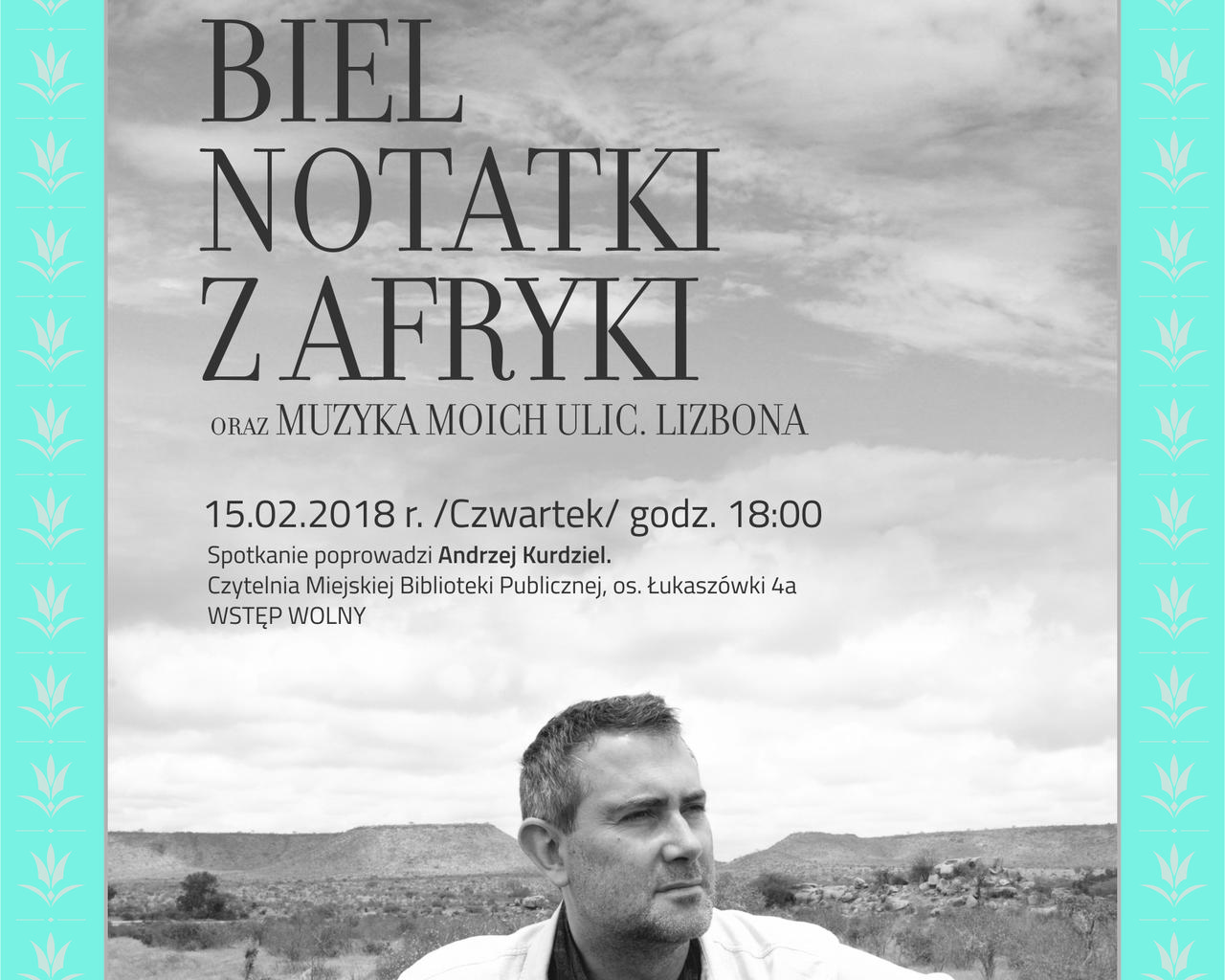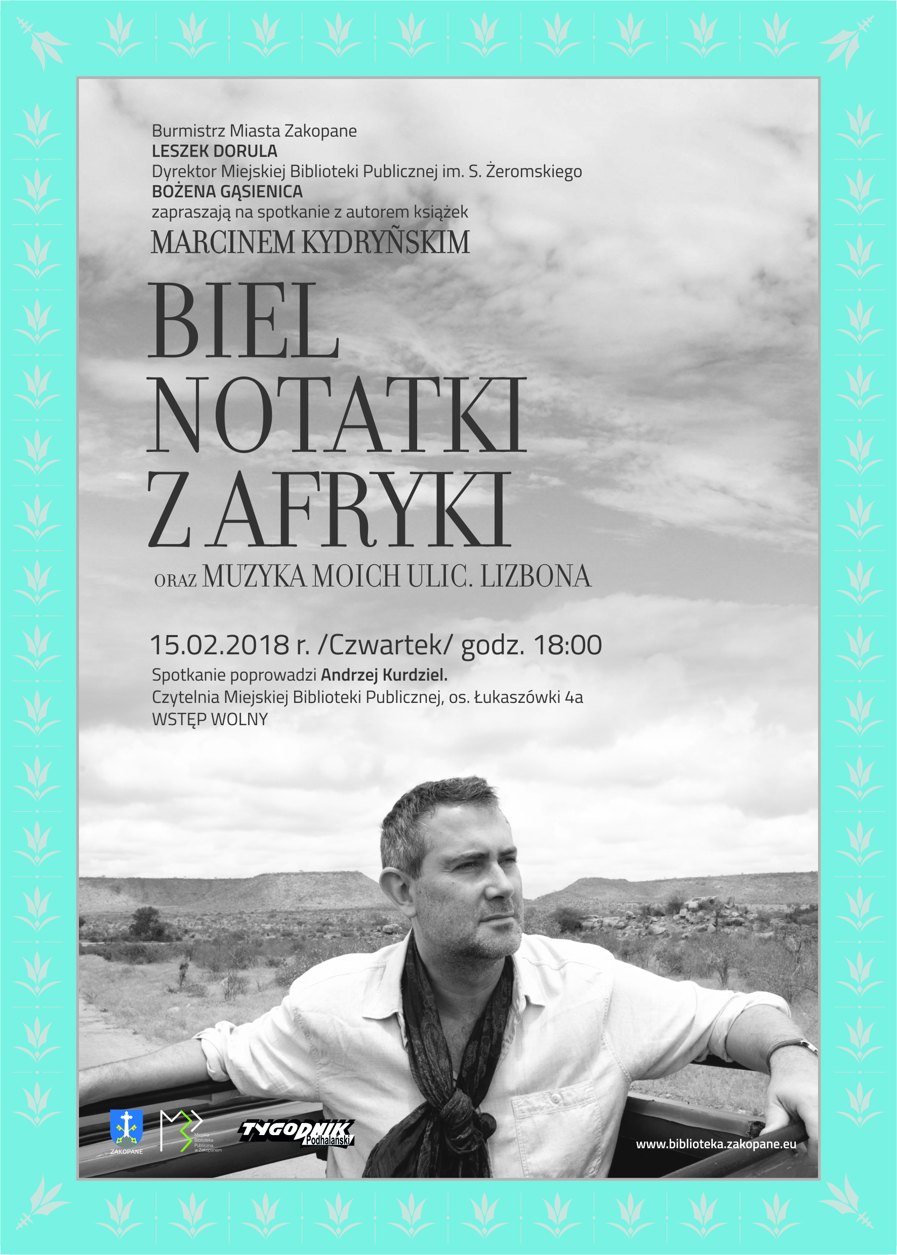 Burmistrz Miasta Zakopane Leszek Dorula i Dyrektor Miejskiej Biblioteki Publicznej im. S. Żeromskiego Bożena Gąsienica zapraszają na spotkanie z autorem książek Biel. Notatki z Afryki oraz Muzyka moich ulic.Lizbona. Marcinem Kydryńskim.