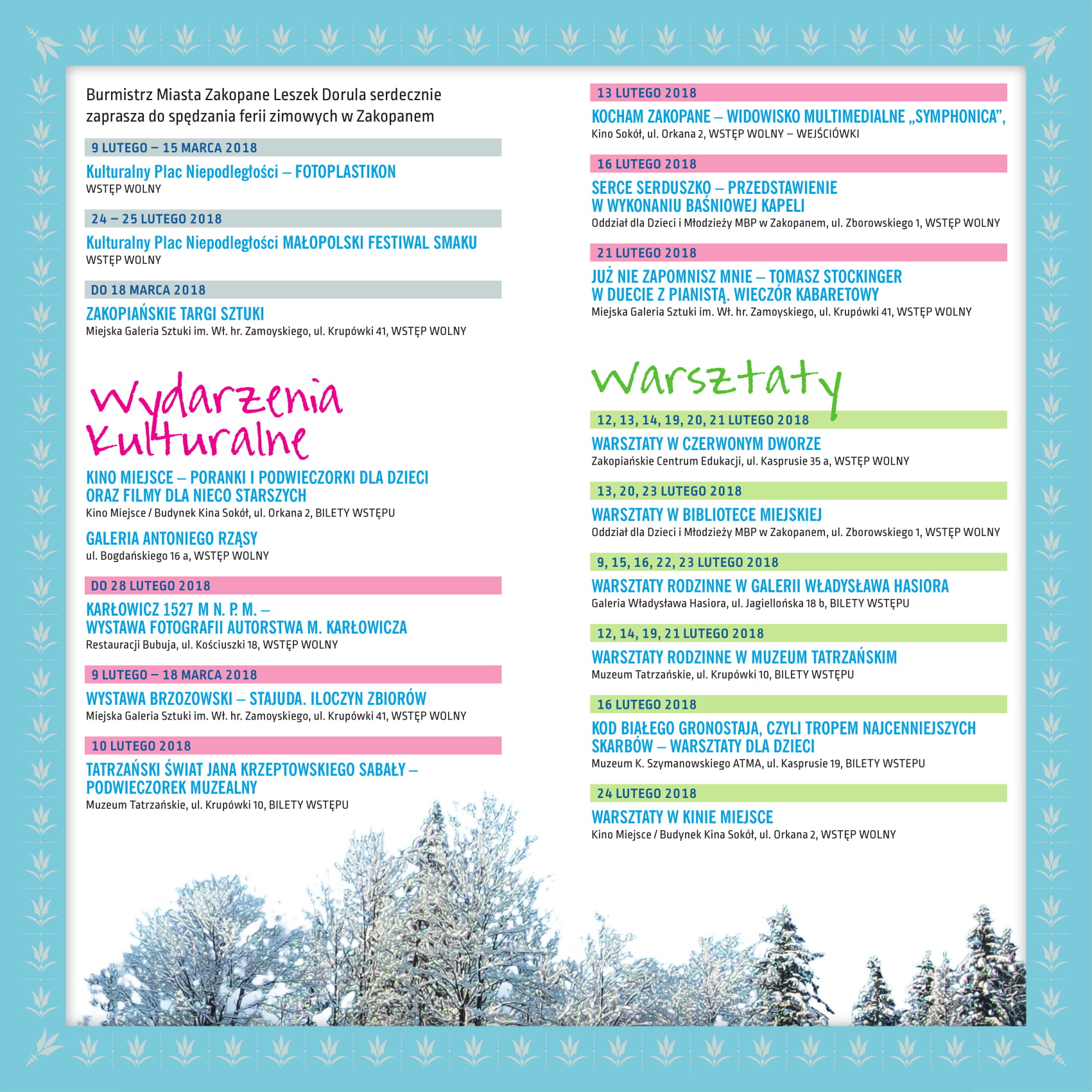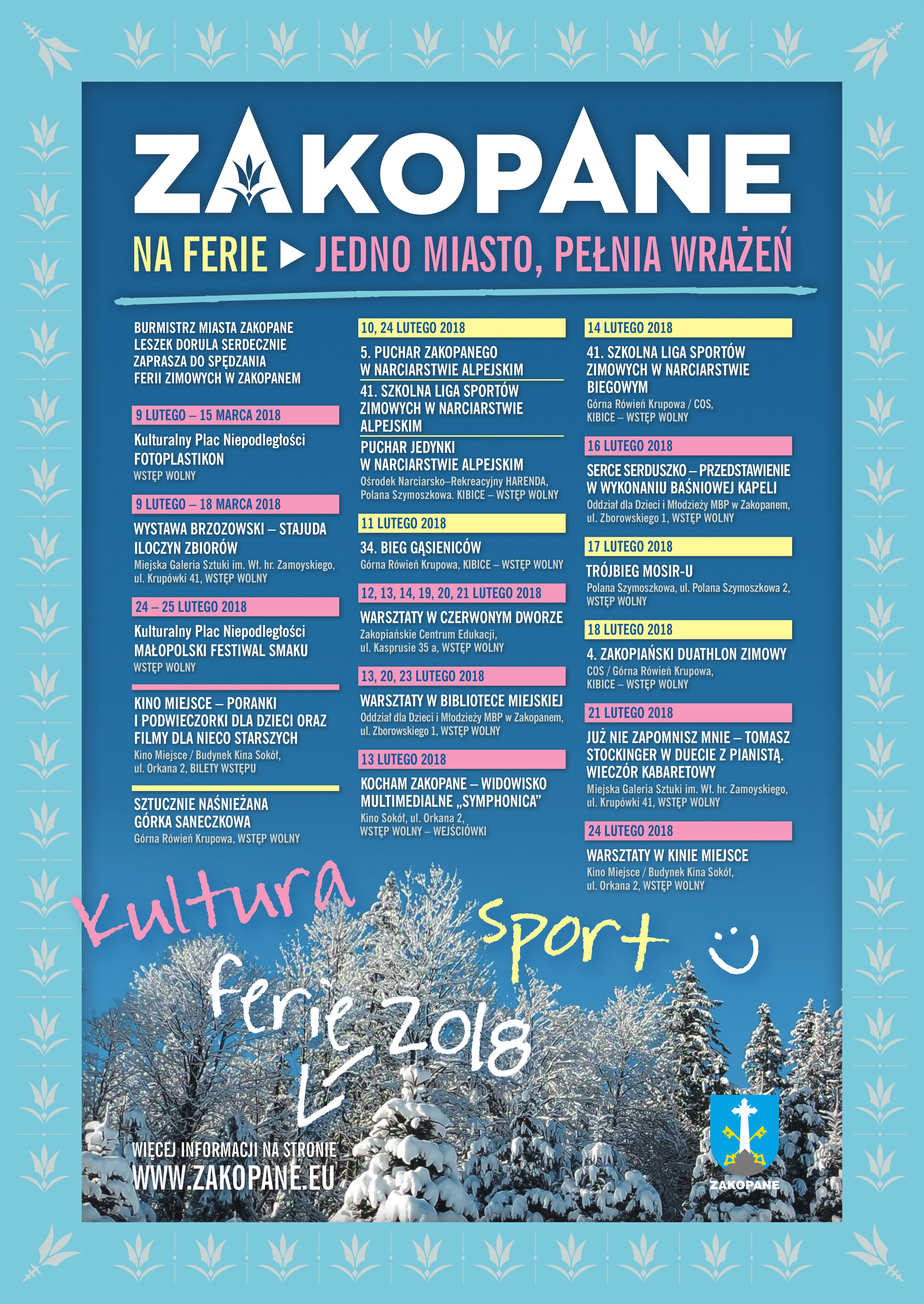 Burmistrz Miasta Zakopane Leszek Dorula serdecznie zaprasza do rodzinnego spędzania ferii zimowych na stokach narciarskich, trasach biegowych, lodowiskach oraz na wydarzenia kulturalne i sportowe.