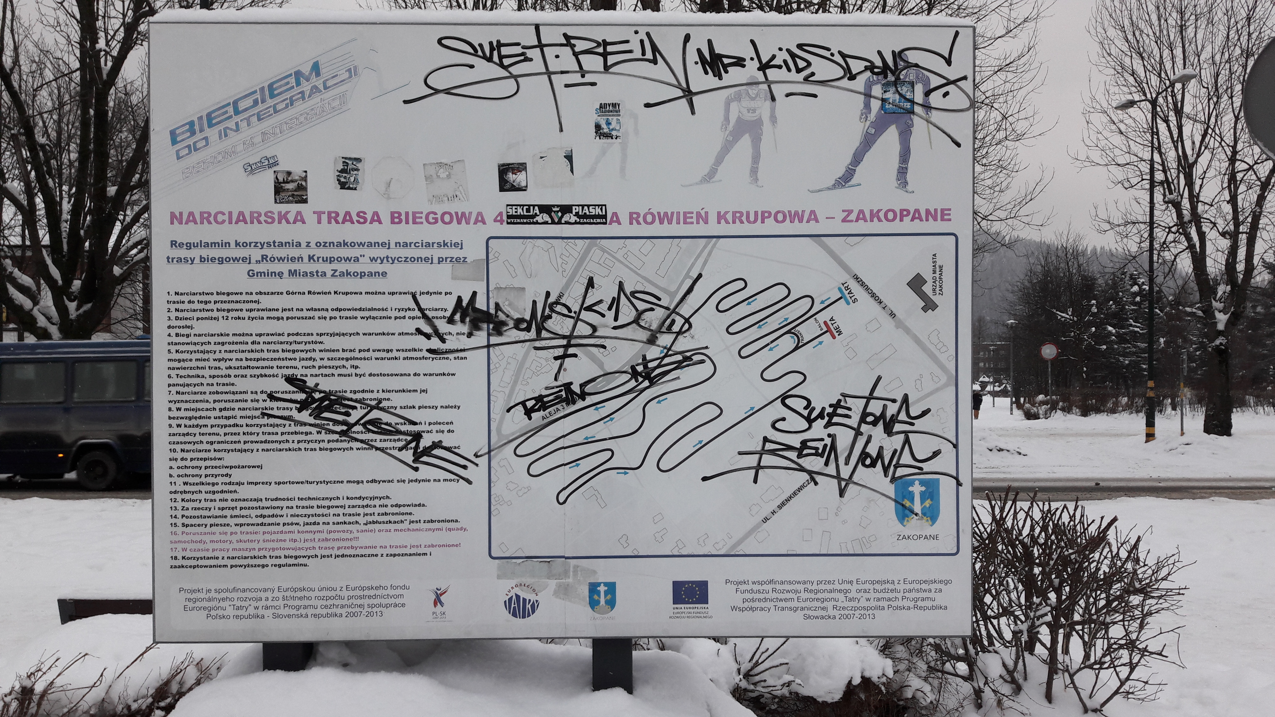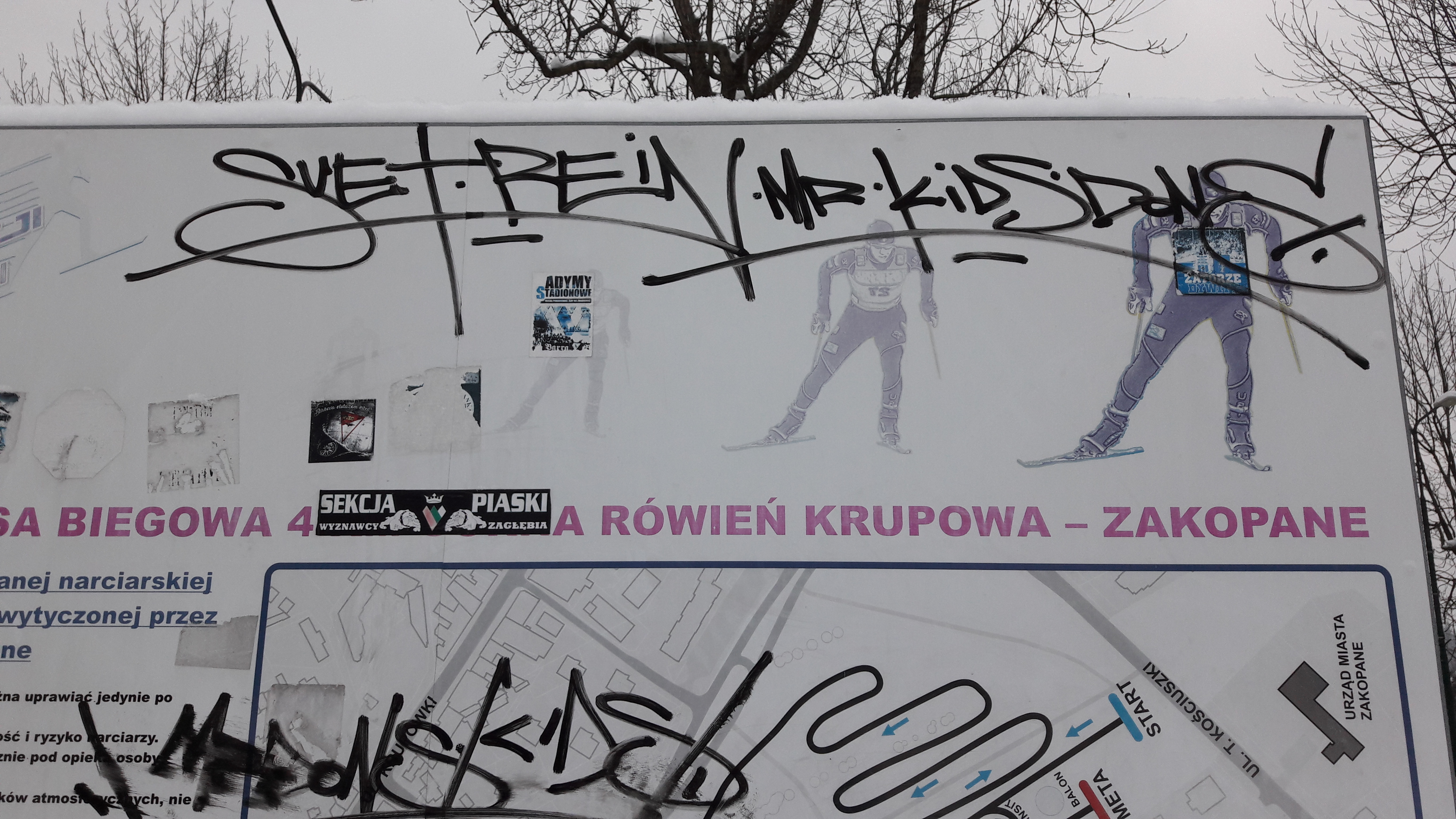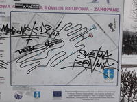 Z przykrością zawiadamiamy, że po raz kolejny nieznani sprawcy zniszczyli i ukradli oznaczenia i tablice informacyjne narciarskiej trasy biegowej na Górnej Równi Krupowej.
