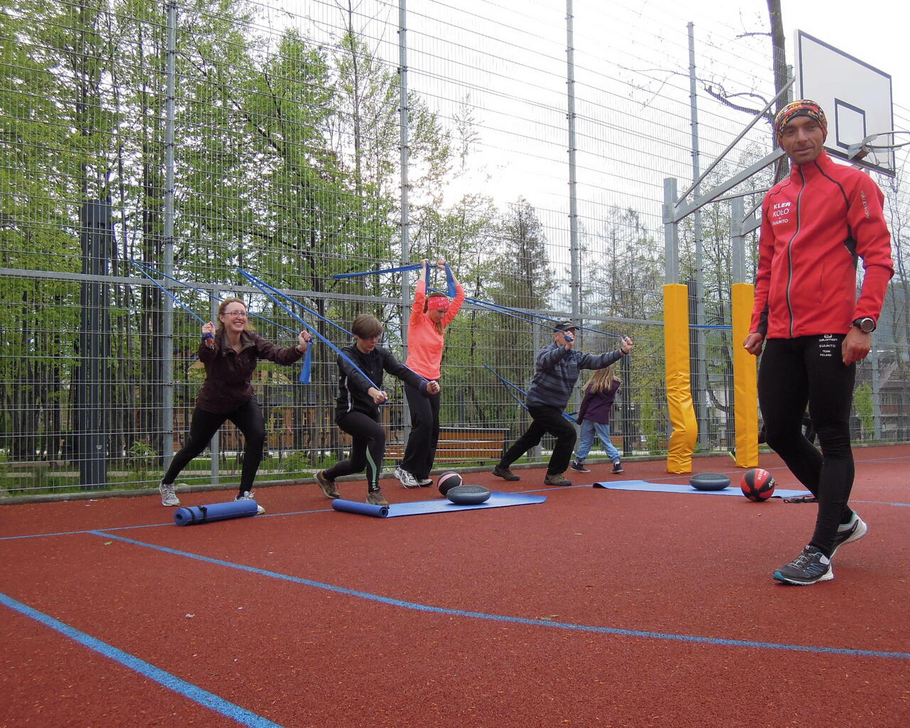 Uczestnicy zajęć wykonali ćwiczenia, które powinno się stosować w ramach rozgrzewki przed bieganiem. Zapoznali się również przyrządami, których można używać samodzielnie, a które zastąpić mogą wizyty na siłowni. Ich umiejętne stosowanie zapewni wzmocnienie wszelkich partii mięśni oraz ścięgien, poddawanych obciążeniom podczas biegów.