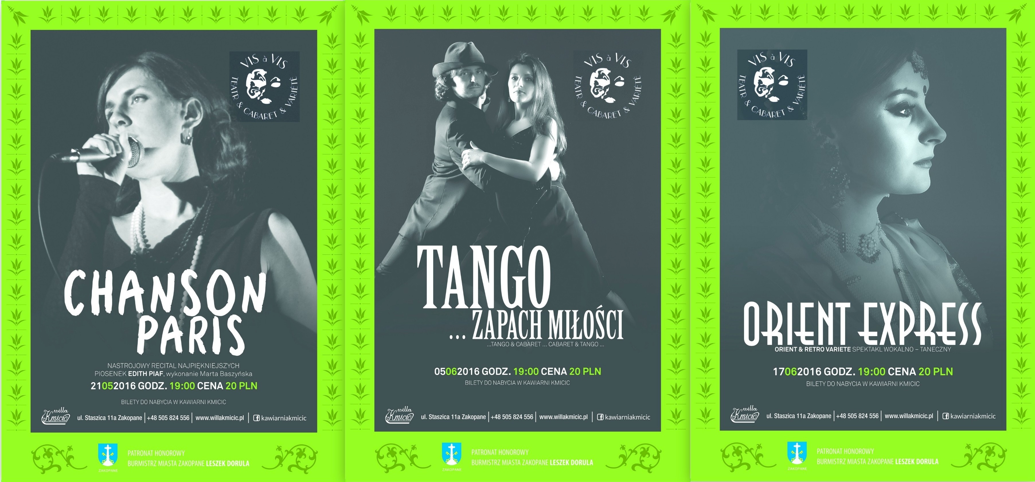 Zakopiańska Scena Teatru „Vis à Vis”, działająca pod patronatem honorowym Burmistrza Miasta Zakopane Leszka Doruli, w maju i w czerwcu zaprasza na kolejne spektakle. 21 maja w Willi Kmicic zobaczymy nastrojowy recital piosenek Edith Piaf „Chanson Paris”, natomiast 5 czerwca spektakl muzyczny z polskimi i argentyńskimi tangami okresu dwudziestolecia międzywojennego. Z kolei 17 czerwca Teatr „Vis à Vis” zabierze nas w muzyczną, wokalną i taneczną podróż Orient Expressem.