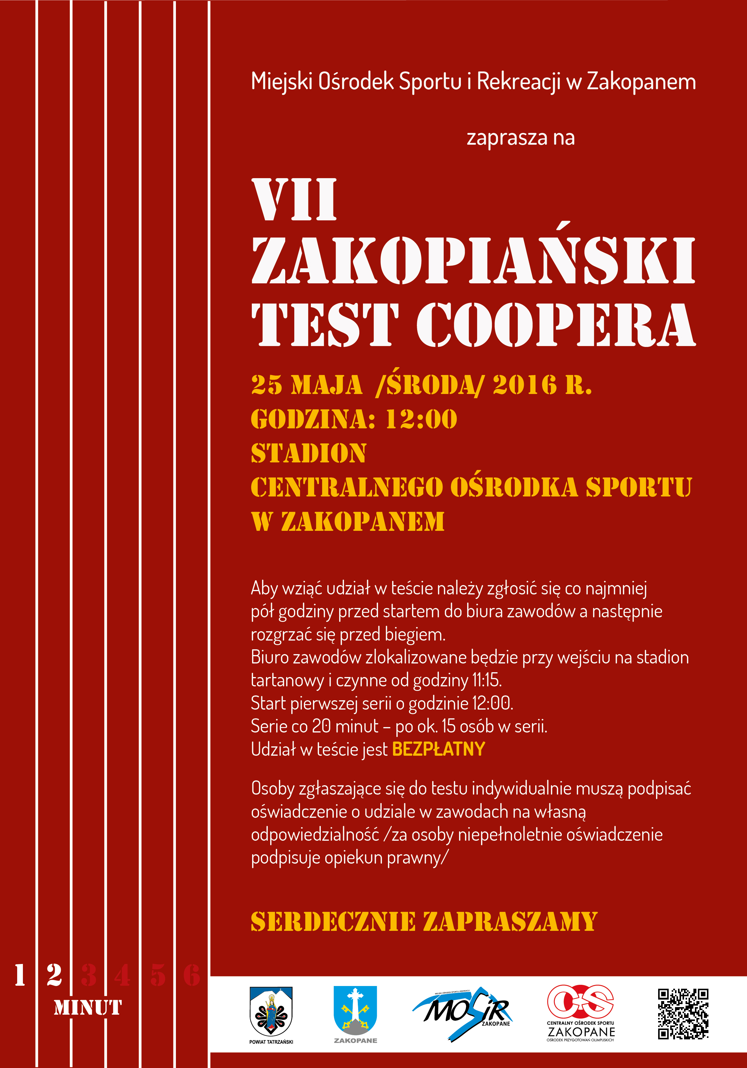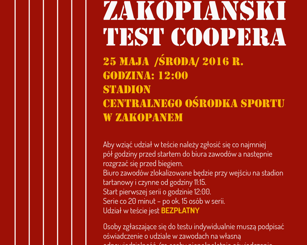25 maja (środa) o godzina 12.00 na Stadionie Centralnego Ośrodka Sportu w Zakopanem odbędzie się Test Coopera. Aby wziąć w nim udział należy zgłosić się co najmniej pół godziny przed startem do biura zawodów, a następnie rozgrzać się przed biegiem. Biuro zawodów zlokalizowane będzie przy wejściu na stadion tartanowy i czynne od godziny 11.15. Start pierwszej serii o godzinie 12.00. Serie co 20 minut – po ok. 15 osób w serii. Udział w teście jest bezpłatny.