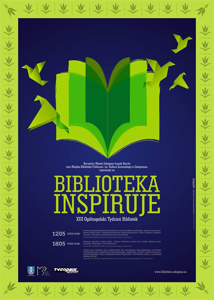 Burmistrz Miasta Zakopane Leszek Dorula oraz Miejska Biblioteka Publiczna im. Stefana Żeromskiego w Zakopanem zapraszają na XIII Ogólnopolski Tydzień Bibliotek Biblioteka Inspiruje.
