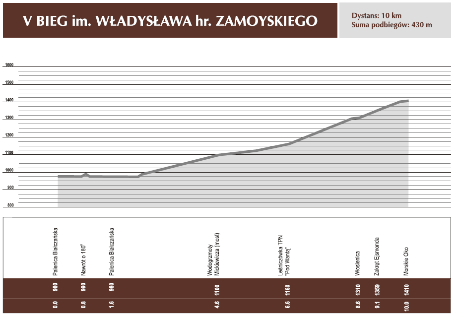 5 czerwca 2016r. - VII Bieg im. hr. Władysława Zamoyskiego: trasa biegu prowadzi drogą asfaltową z Palenicy Białczańskiej przez Wodogrzmoty Mickiewicza do Morskiego Oka (dystans: 10,0 km, deniwelacja: +430)