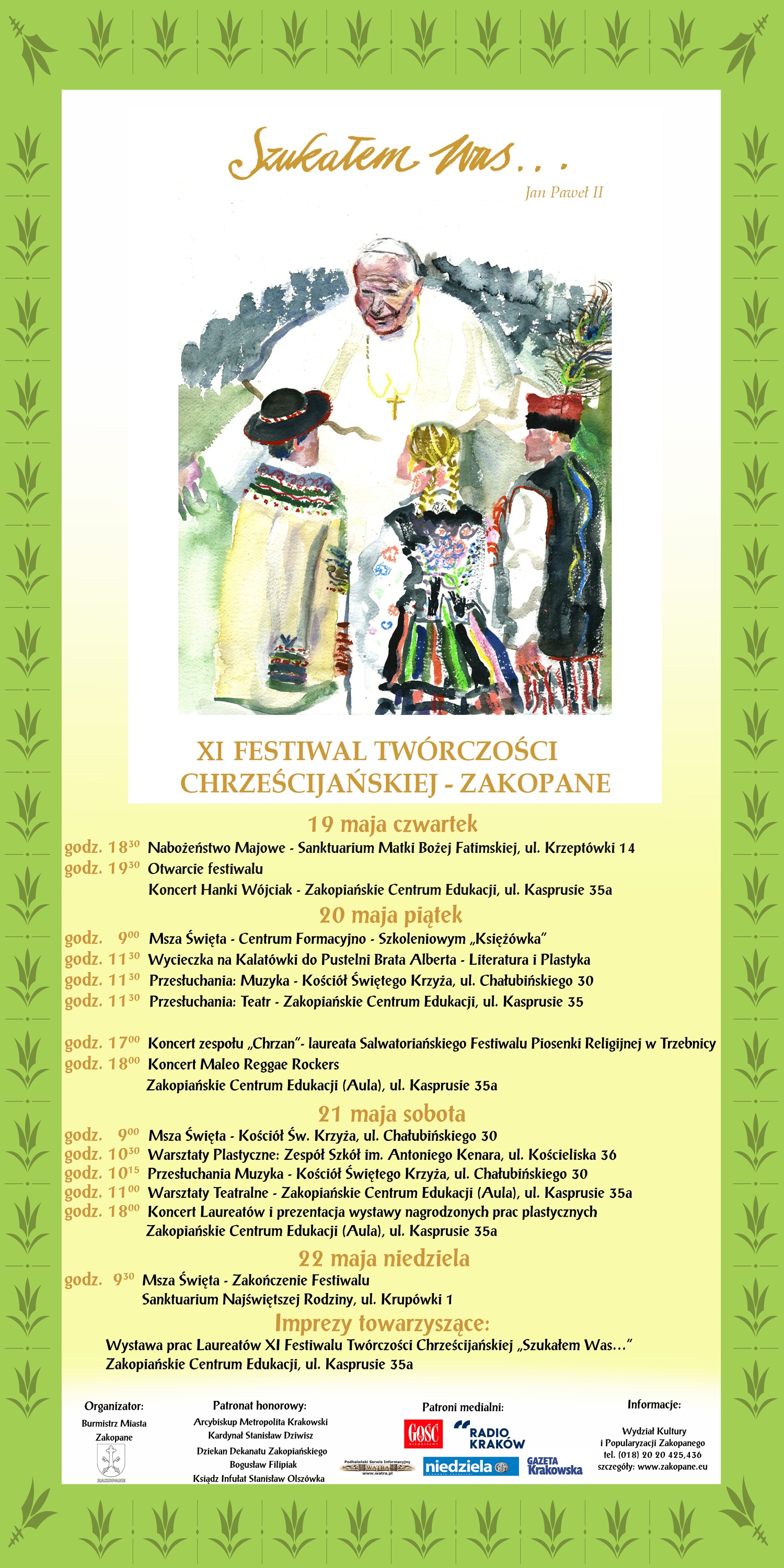 Burmistrz Miasta Zakopane Leszek Dorula zaprasza do udziału w XI Festiwalu Twórczości Chrześcijańskiej „Szukałem Was...” w dniach 19-22 maja 2016 r.