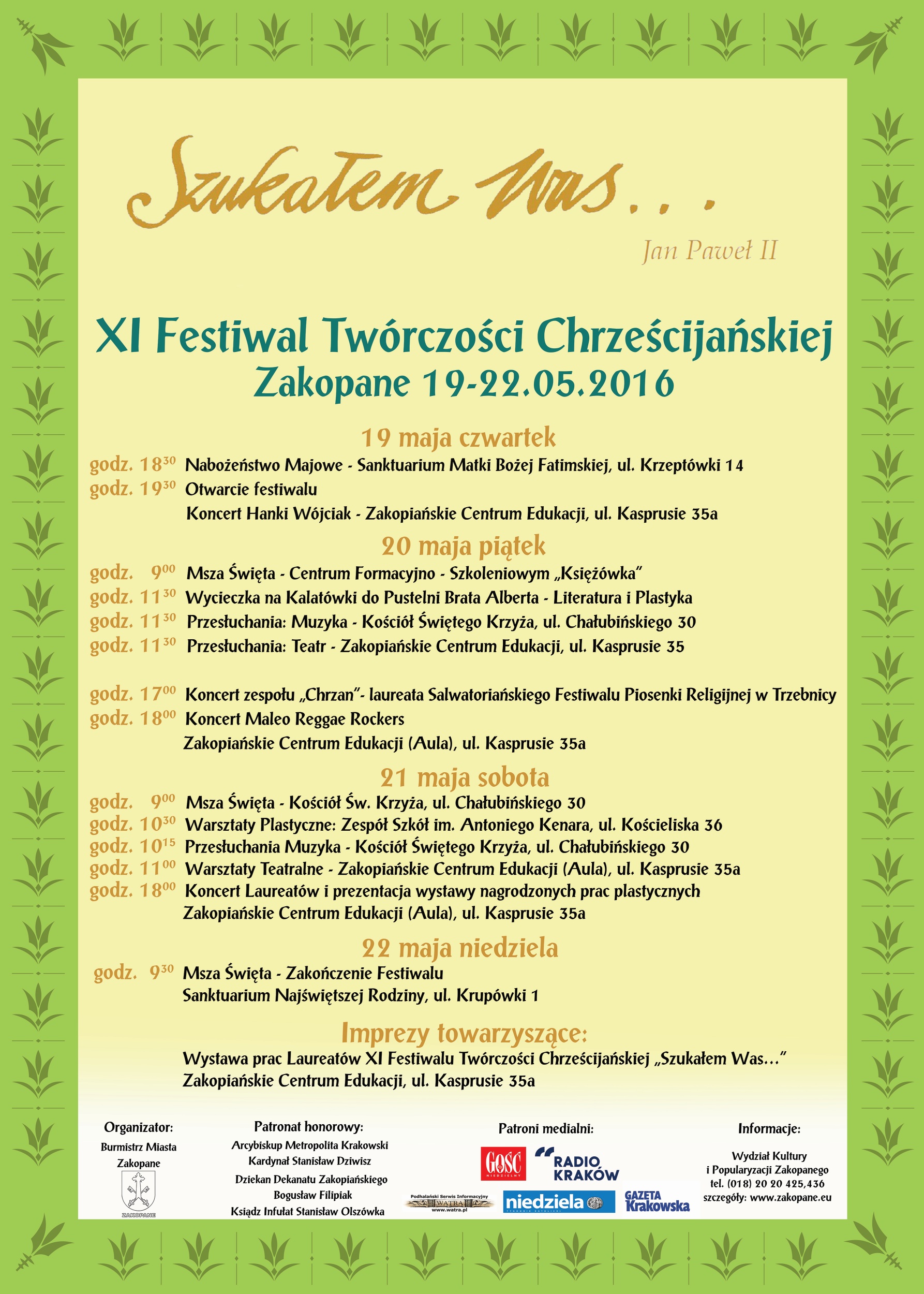 W dniach 19-22 maja 2016r. w Zakopanem odbędzie się XI Festiwal Twórczości Chrześcijańskiej „Szukałem Was…”. Festiwal jest świętem młodości i kultury, odbywającym się corocznie z okazji Dni Zakopanego, które uchwałą Rady Miasta Zakopane z31 lipca 2002 roku zostały ustanowione dla upamiętnienia wizyty Ojca Świętego Jana Pawła II pod Tatrami w czerwcu 1997 roku.