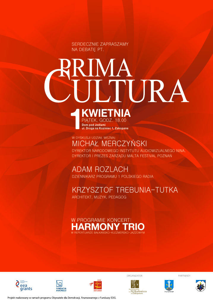 Stowarzyszenie im. Mieczysława Karłowicza serdecznie zaprasza 1 kwietnia (piątek) o godzinie 18.00 do Domu pod Jedlami na debatę pt. PRIMA CULTURA oraz koncert "Harmony Trio" w repertuarze bałkańsko-klezmersko-jazzowym.