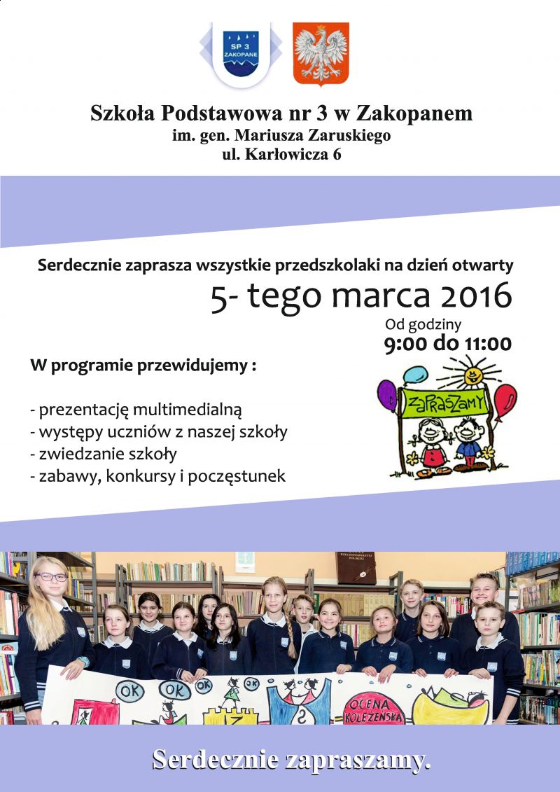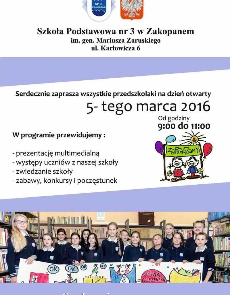 Szkoła Podstawowa Nr 3 im. gen. Mariusza Zaruskiego, ul. Karłowicza 6, zaprasza wszystkie przedszkolaki wraz z rodzicami na dzień otwarty 5 marca w godz. 9.00 do 11.00.