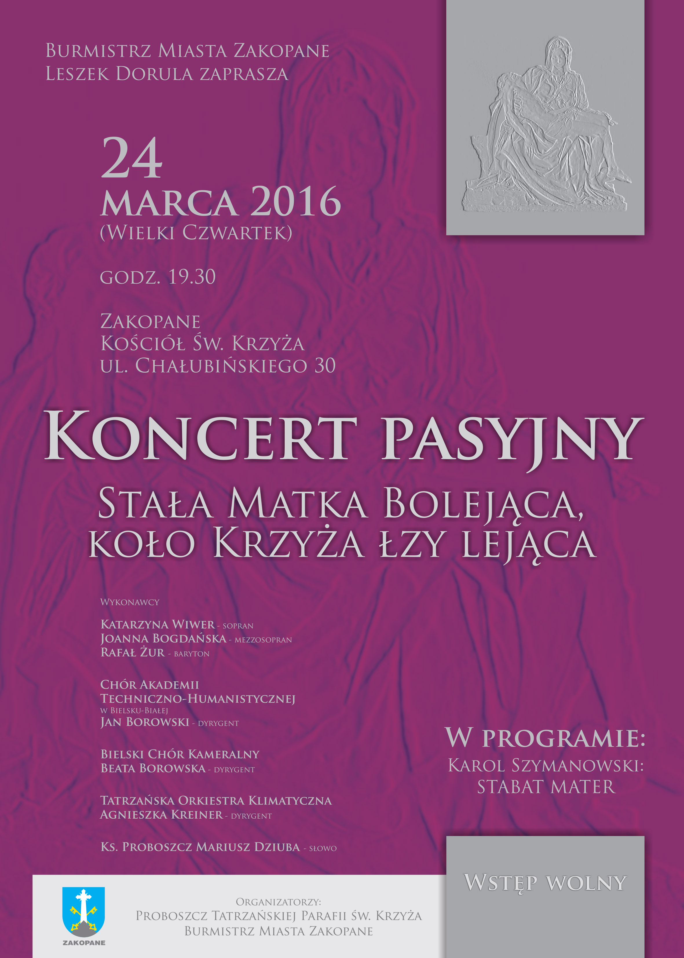 Burmistrz Miasta Zakopane Leszek Dorula zaprasza 24 marca (Wielki Czwartek) o godz. 19.30 do Kościoła św. Krzyża na koncert pasyjny "Stała Matka Bolejąca, koło Krzyża łzy lejąca" w wykonaniu Tatrzańskiej Orkiestry Klimatycznej.