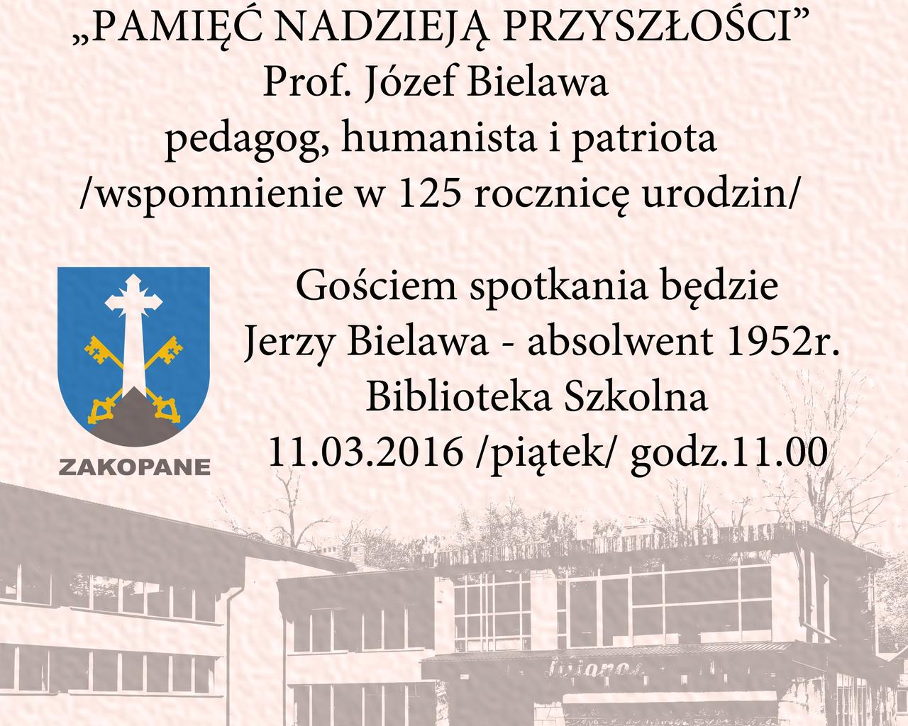 Stowarzyszenie Absolwentów Liceum Ogólnokształcącego im. Oswalda Balzera w Zakopanem zaprasza na spotkanie z cyklu "Pamięć nadzieją przyszłości". Będzie to wspomnienie o wybitnym patriocie, humaniście i pedagogu prof. Józefie Bielawie.
