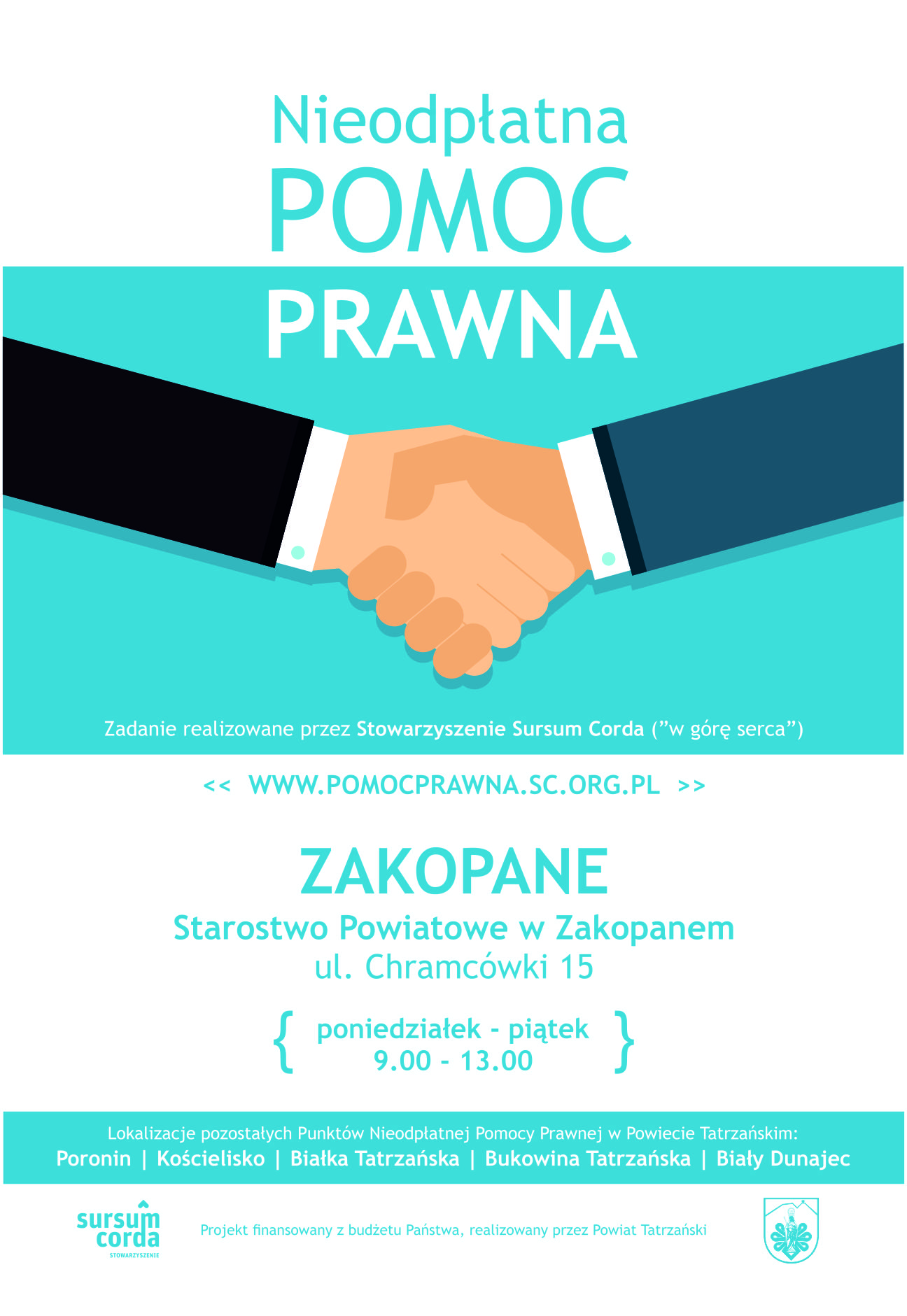 Bezpłatna pomoc prawna udzielana jest przez doświadczonych prawników w punkcie prowadzonym przez Stowarzyszenie Sursum Corda, znajdującym się w budynku Starostwa Powiatowe w Zakopanem (Pawilon C), przy ul. Chramcówki 15.