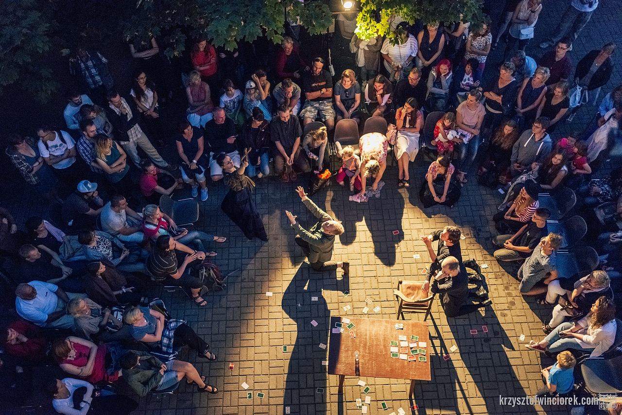 Gramy na podwórkach, tarasach, trawnikach, placach a każde z tych miejsc skradniemy na kilka dni i wypełnimy opowieścią! Wszystko jest na wyciągnięcie ręki, nie ma bariery sceny i nie trzeba mieć wiedzy o teatrze, żeby wczuć się w to, co chcemy powiedzieć. Poprzez prezentowanie żywej sztuki teatru w wybranych przestrzeniach w pobliżu centrum Miasta (plaża, ogródki kawiarniane, schody przed muzeum Miasta Gdyni, podwórza kamienic, place) i wyjście poza mury teatralne, dokonujemy zbliżenia i osobistego spotkania z widzem, odartego z konwencji anonimowej i zimnej obserwacji z ciemności, z teatralnego fotela. Szukamy sytuacji, które mogłyby zmienić skostniałe relacje między sceną pudełkową a publicznością, a także między sceną a aktorem. Zapraszamy na spotkanie, wspólny dialog, akt tworzenia wspólnej metafizyki w miejscu do tego nieprzeznaczonym.