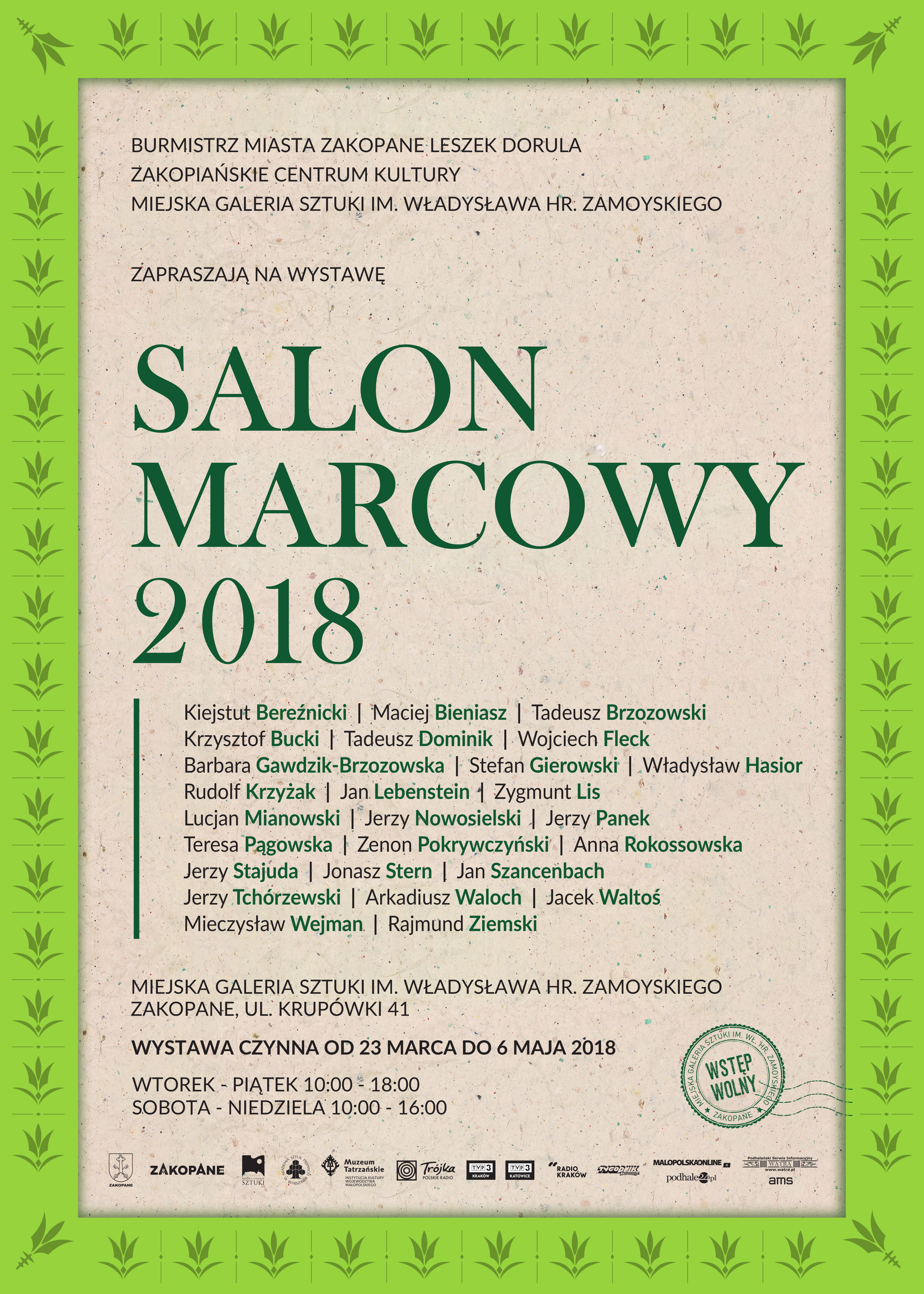 Burmistrz Miasta Zakopane Leszek Dorula, Zakopiańskie Centrum Kultury oraz Miejska Galeria Sztuki im. Władysława hr. Zamoyskiego zapraszają na wernisaż wystawy "Salon Marcowy 2018" w piątek 23 marca o godz. 17:00. Wystawa czynna do 6 maja.