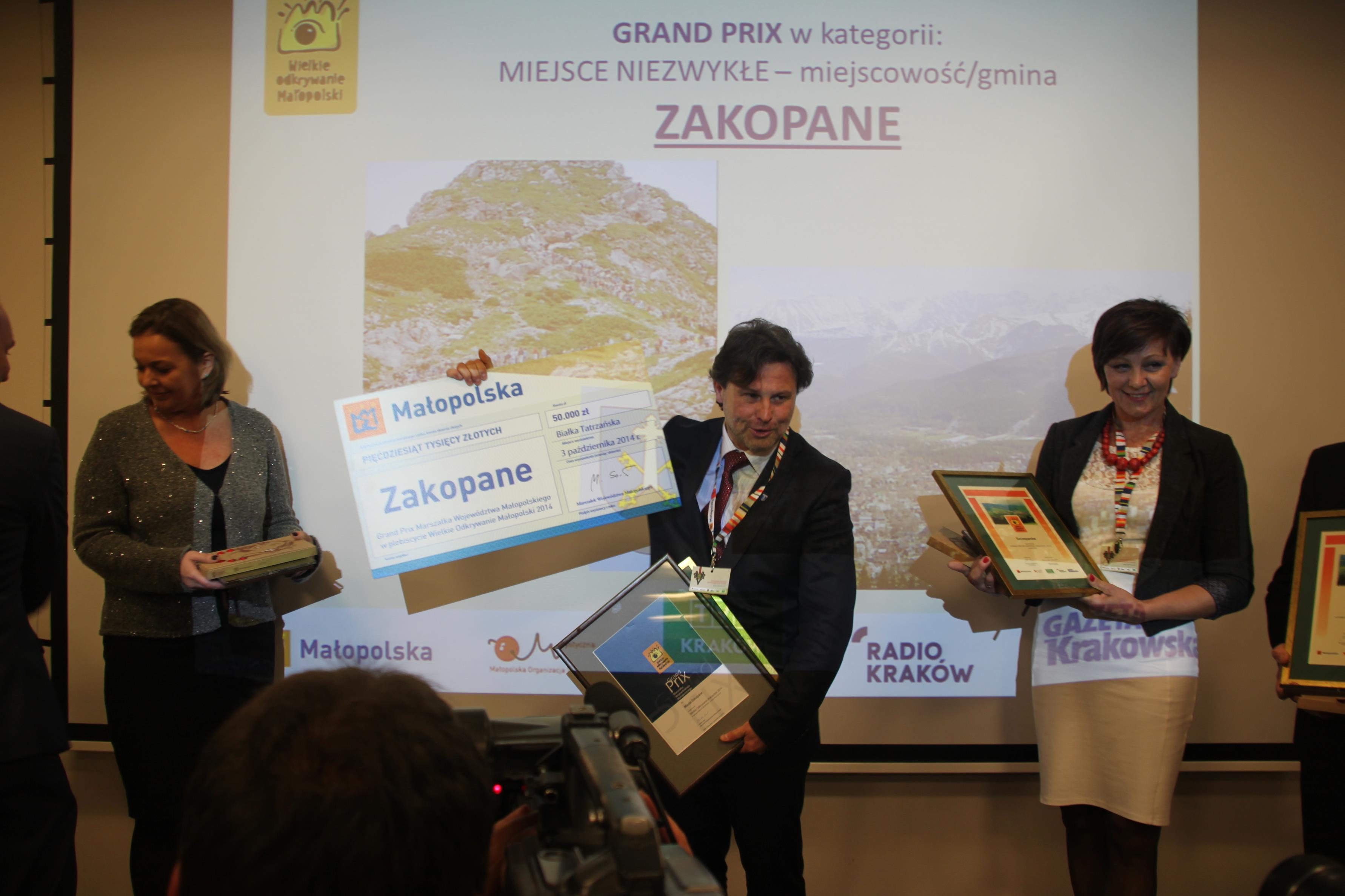 Nagrodę w postaci czeku w wysokości 50 tys. zł z rąk marszałka województwa małopolskiego Marka Sowy odebrał wiceburmistrz Zakopanego Mariusz Koperski.
