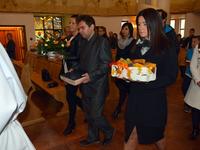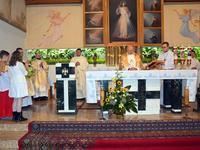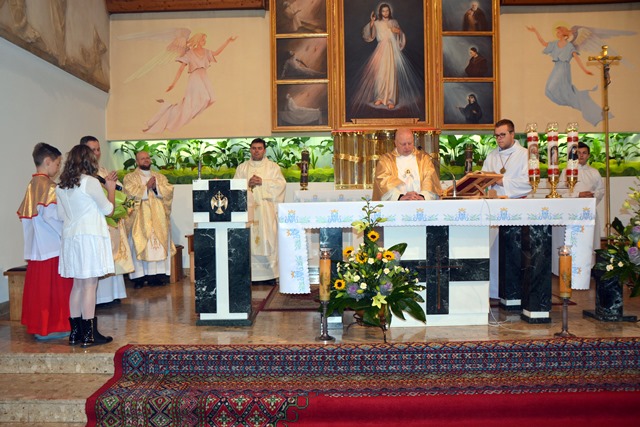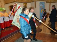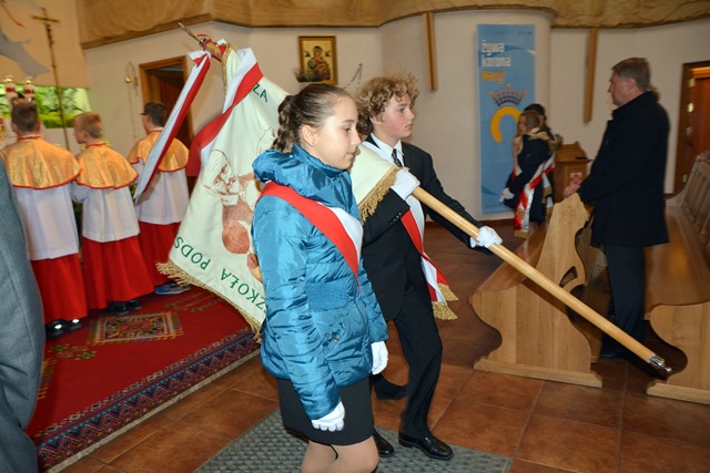 Rano społeczność szkoły i goście uczestniczyli we mszy świętej w kościele Bożego Miłosierdzia przy ulicy Chramcówki. We mszy świętej, której przewodniczył proboszcz ks. Piotr Pławecki, uczestnicy modlili się za tych, którzy odeszli do wieczności, ale również za tych, którzy dzisiaj tworzą społeczność szkoły – uczniów, rodziców, nauczycieli i pracowników. Zebrani dziękowali za liczne łaski, a wśród symbolicznych darów uczniowie złożyli zeszyty, nauczyciele kronikę, a rodzice chleb. Następnie wszyscy przeszli ze sztandarem do szkoły, gdzie odbyła się uroczysta akademia.