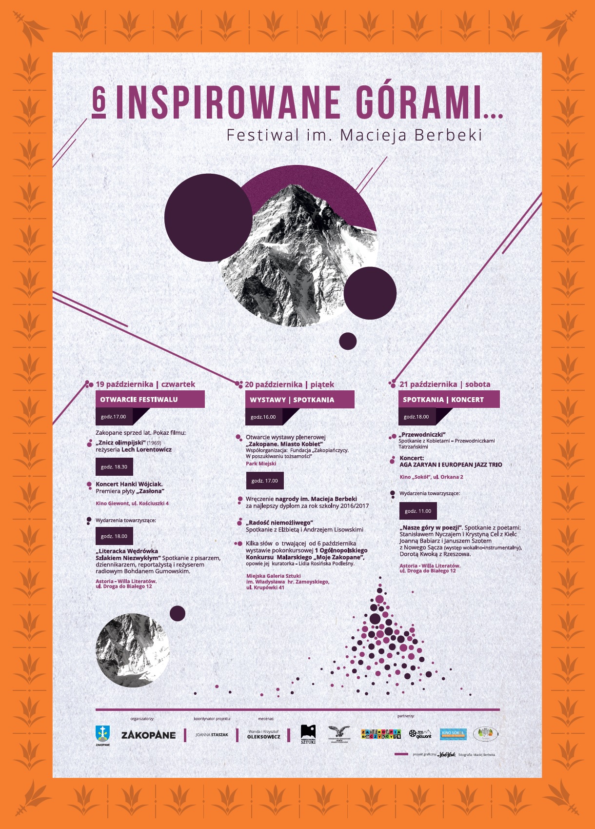 Partnerzy: Zakopiańskie Centrum Kultury, Miejska Galeria Sztuki im. Władysława hr. Zamoyskiego, Towarzystwo Gimnastyczne "Sokół". Gniazdo w Zakopanem, Kino "Sokół", Kino "Giewont", Fundacja „Zakopiańczycy. W poszukiwaniu tożsamości”, Fundacja Domu Literatury i DPT