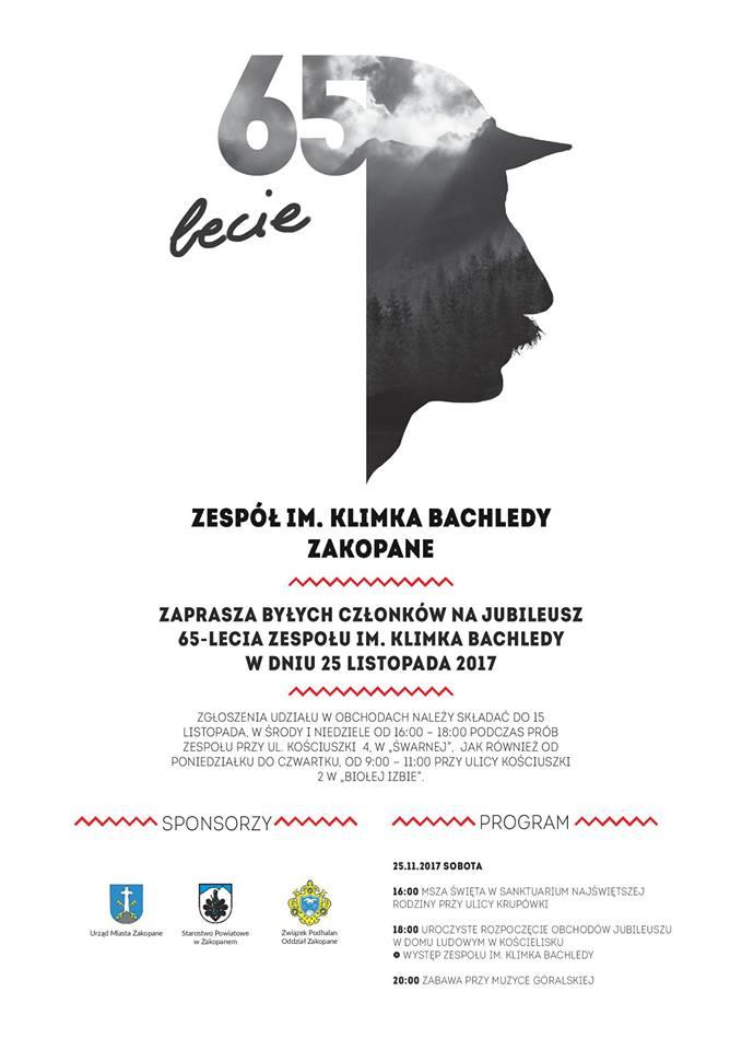 Starostwo Powiatowe w Zakopanem, Związek Podhalan Oddział Zakopane, Urząd Miasta Zakopane zapraszają byłych członków na Jubileusz 65-lecia Zespołu im. Klimka Bachledy, który odbędzie się w dniu 25 listopada 2017.