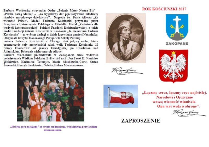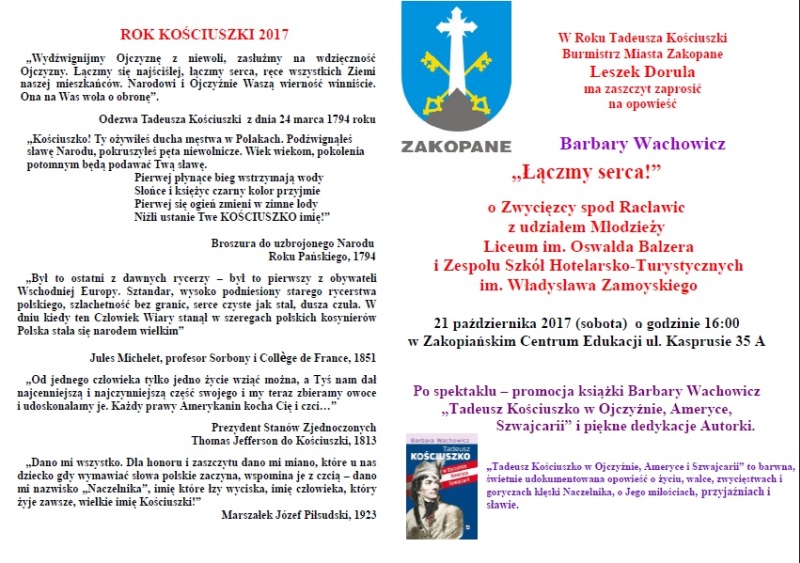 W Roku Tadeusza Kościuszki Burmistrz Miasta Zakopane Leszek Dorula ma zaszczyt zaprosić na opowieść Barbary Wachowicz „Łączmy serca!” o Zwycięzcy spod Racławic z udziałem Młodzieży Liceum im. Oswalda Balzera i Zespołu Szkół Hotelarsko-Turystycznych im. Władysława Zamoyskiego.