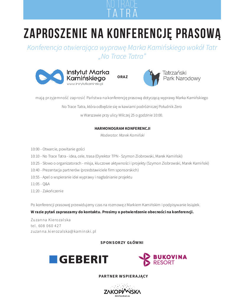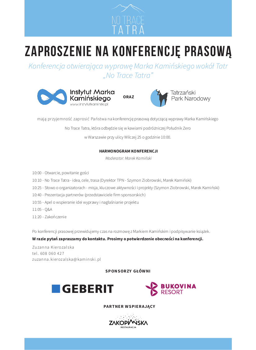 Osiem dni, dwieście kilometrów – już w połowie października Marek Kamiński wyruszy pieszo w fascynującą podróż dookoła Tatr. No Trace Tatra to przedsięwzięcie propagujące ideę minimalizowania wpływu człowieka na środowisko naturalne, świadomego i odpowiedzialnego podróżowania. Celem wędrówki jest zwrócenie uwagi na wyjątkowość Tatr, lecz także problemy, z którymi zmagają się Tatrzańskie Parki Narodowe po obu stronach granicy.