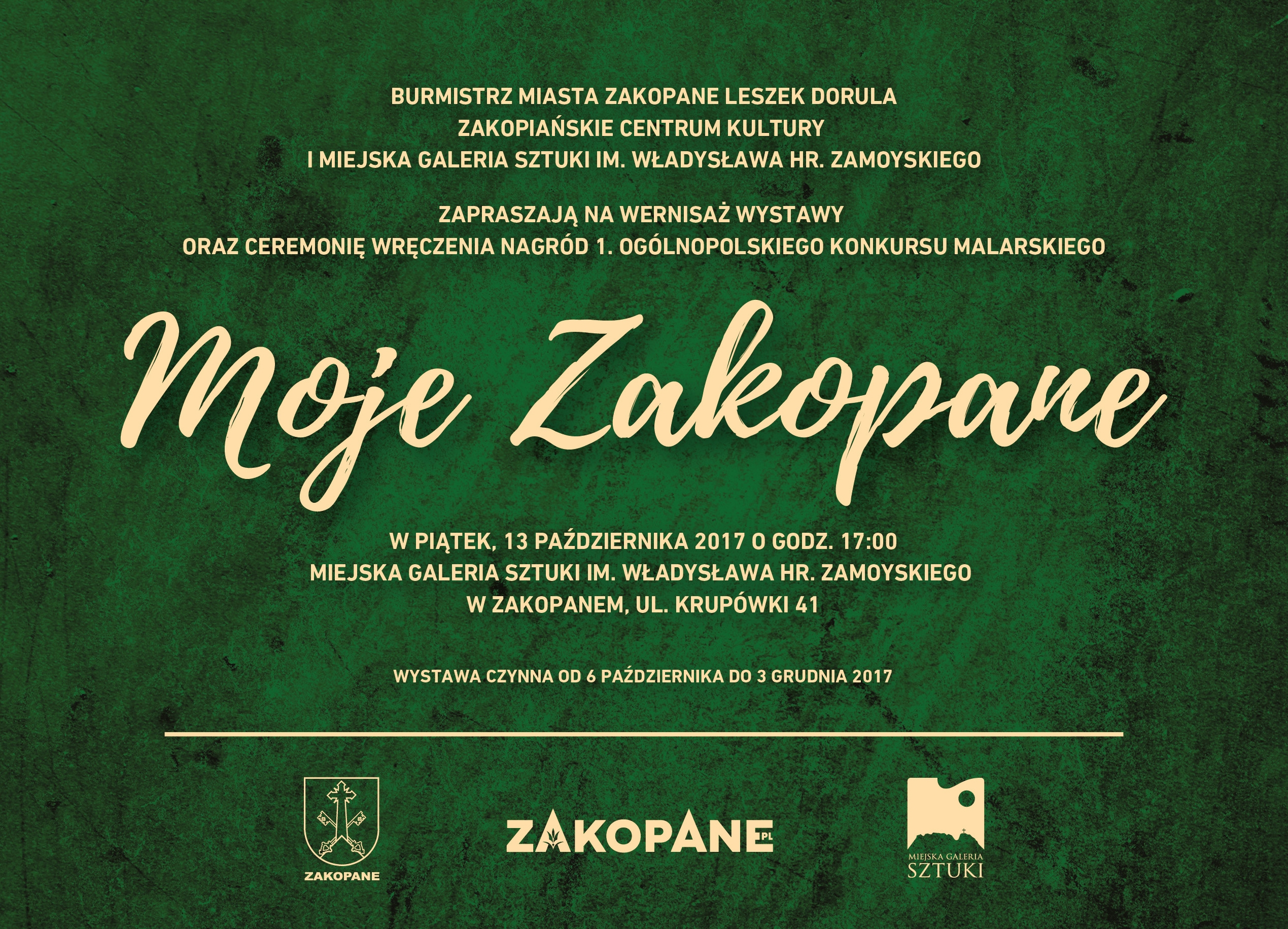 W Miejskiej Galerii Sztuki im. Władysława hr. Zamoyskiego przy Krupówkach, można już oglądać Wystawę Pokonkursową I Ogólnopolskiego Konkursu Malarskiego „Moje Zakopane”. Uroczysty wernisaż wraz z ceremonią wręczenia nagród i wyróżnień odbędzie się 13 października (piątek), o godz. 17.00.